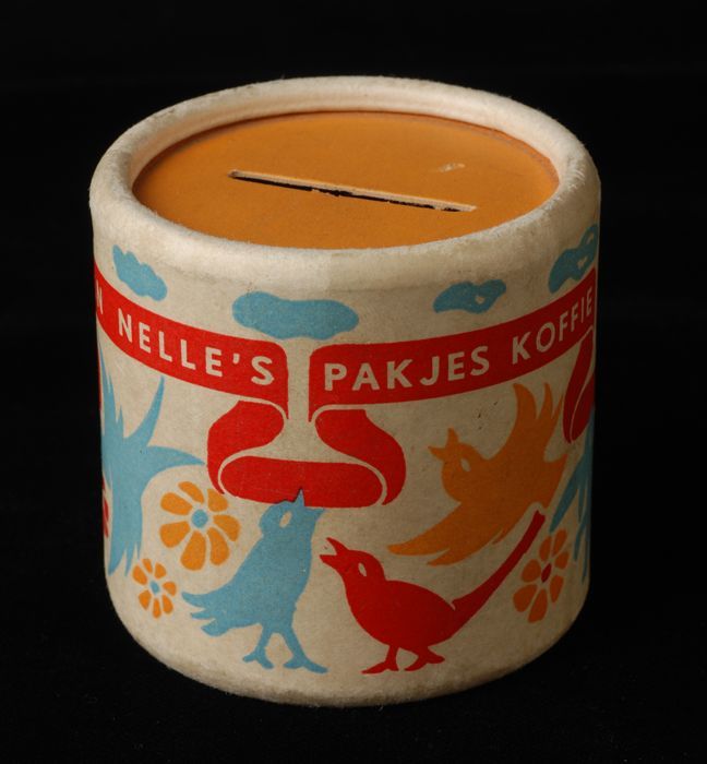 Kartonnen spaarpot met kleurige opdruk van Van Nelle
