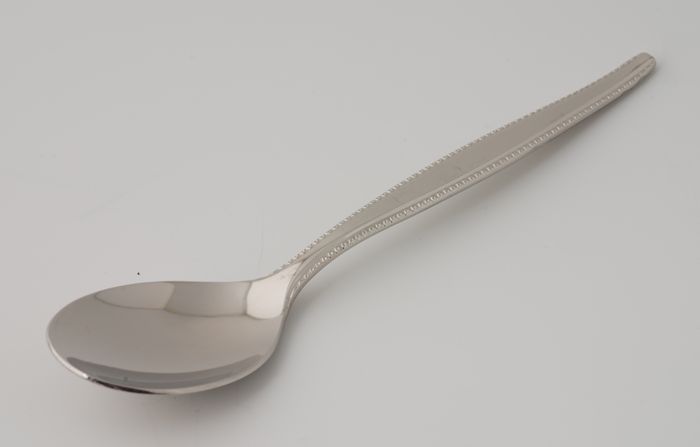 Metalen theelepel van Van Nelle met parelrand