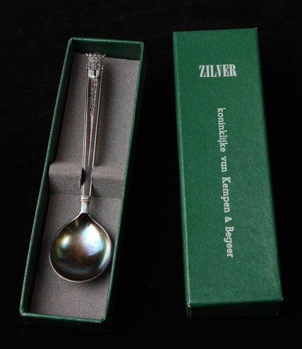 Zilveren theelepel met stadswapen Rotterdam, in doos