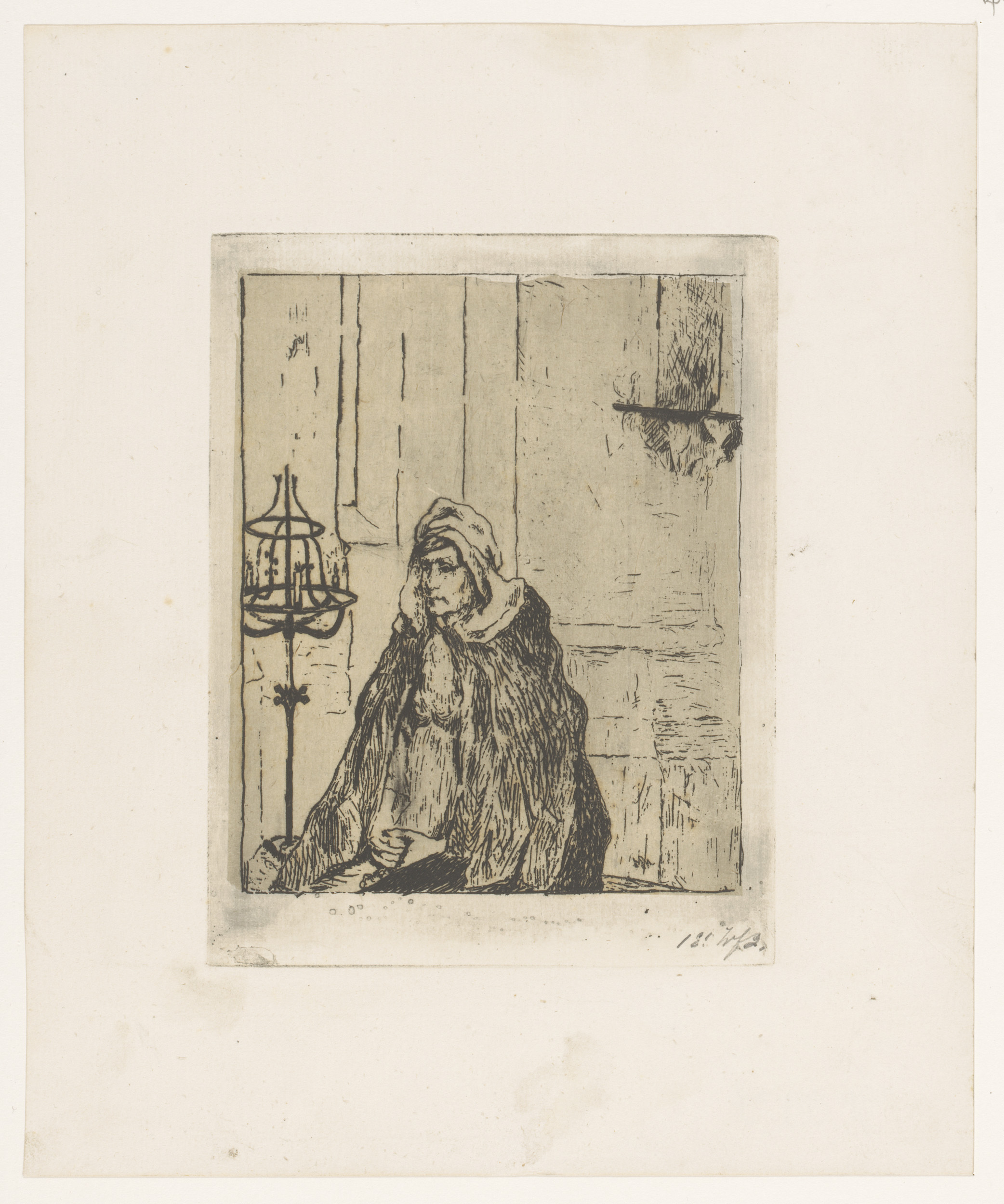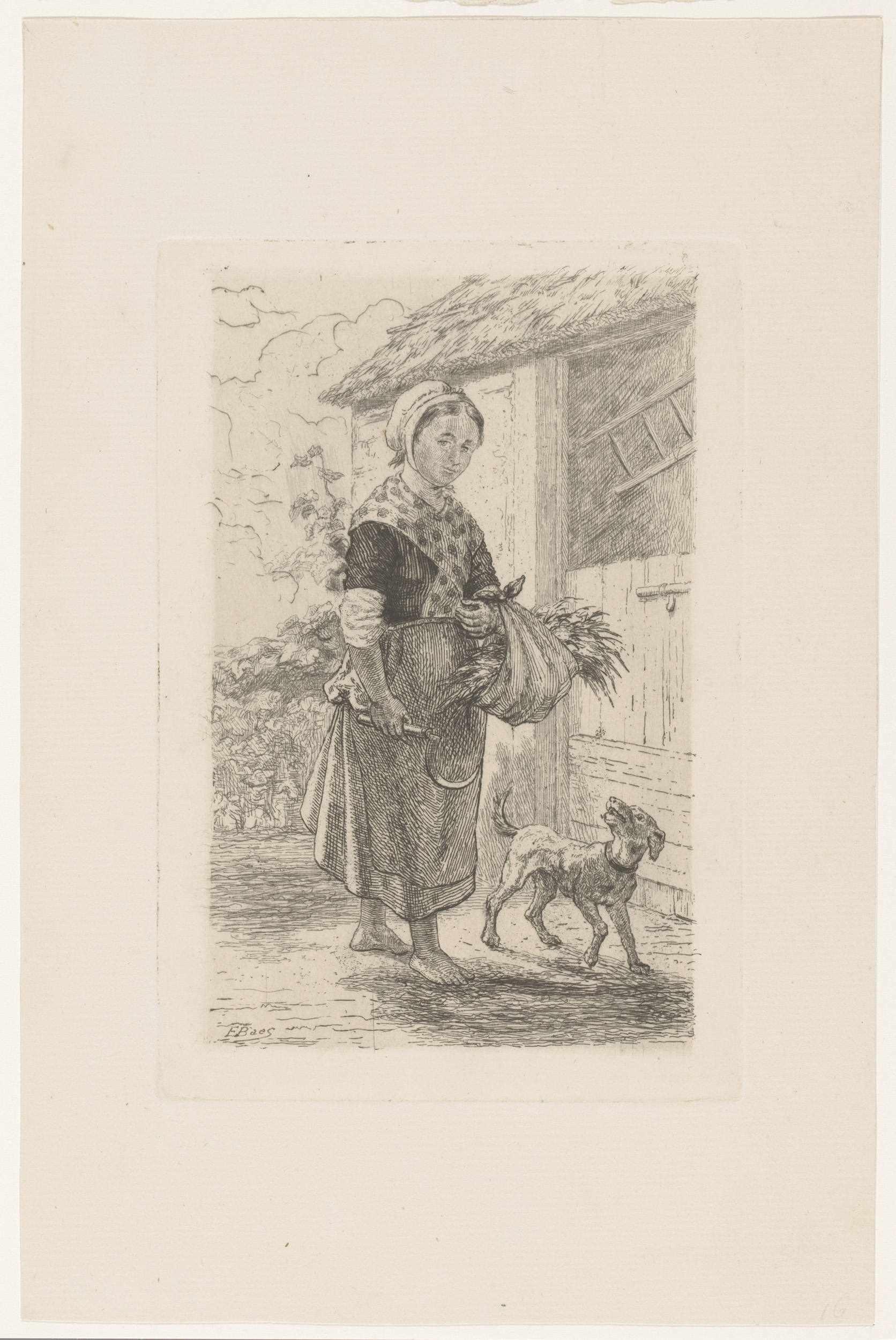 Boerin met sikkel en bundel gras bij een schuur