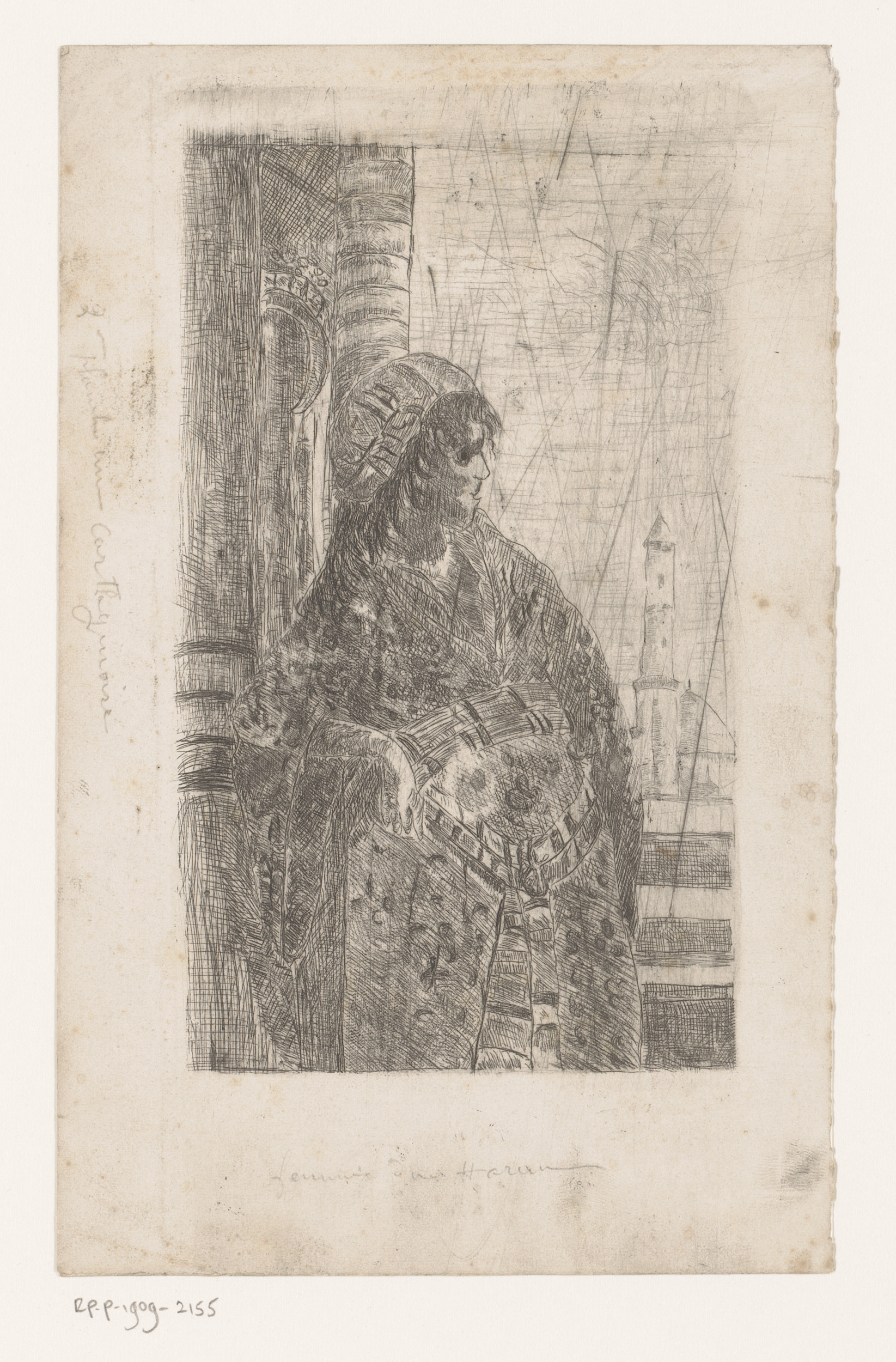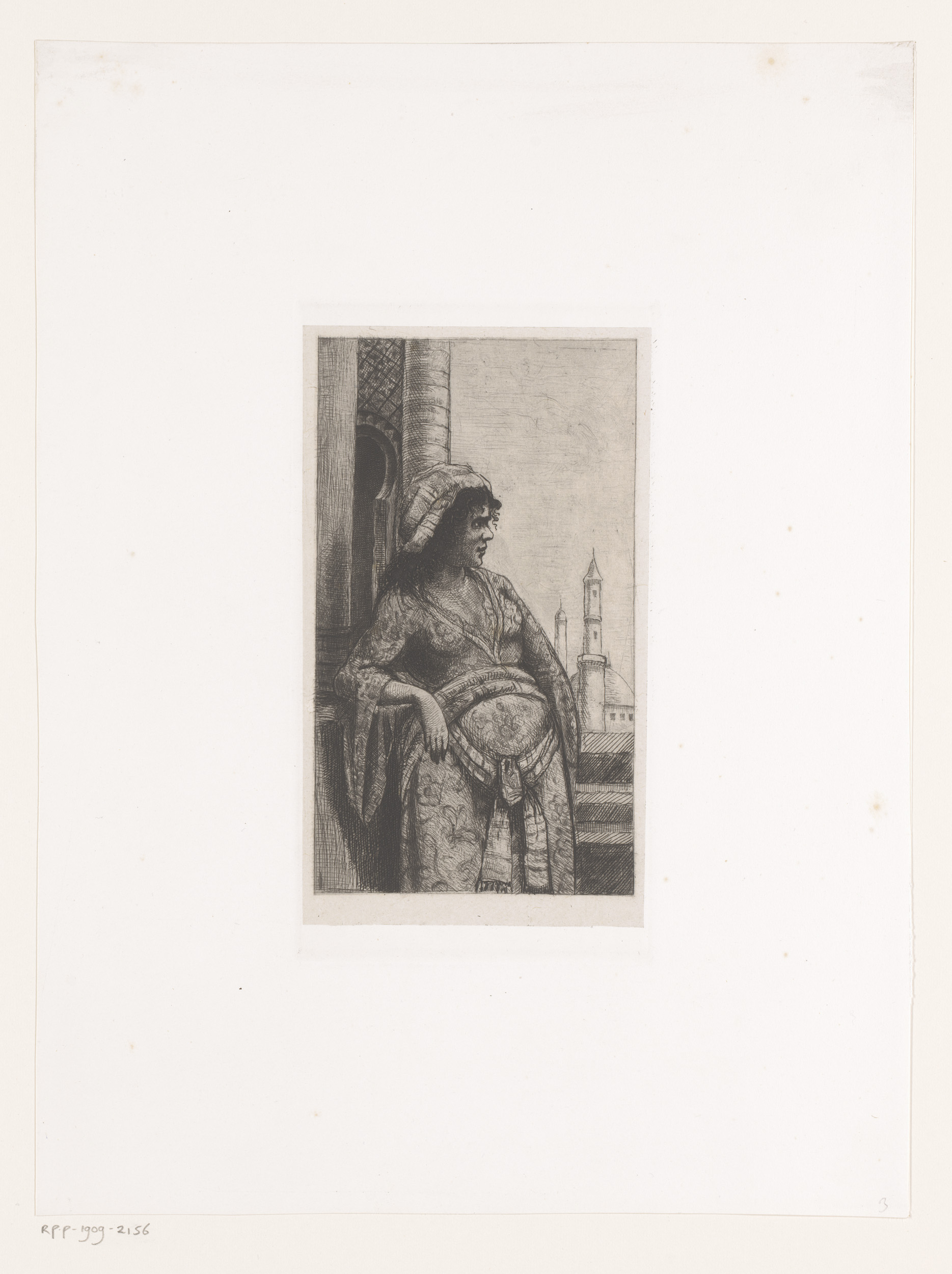 Vrouw op balustrade met moskee op de achtergrond