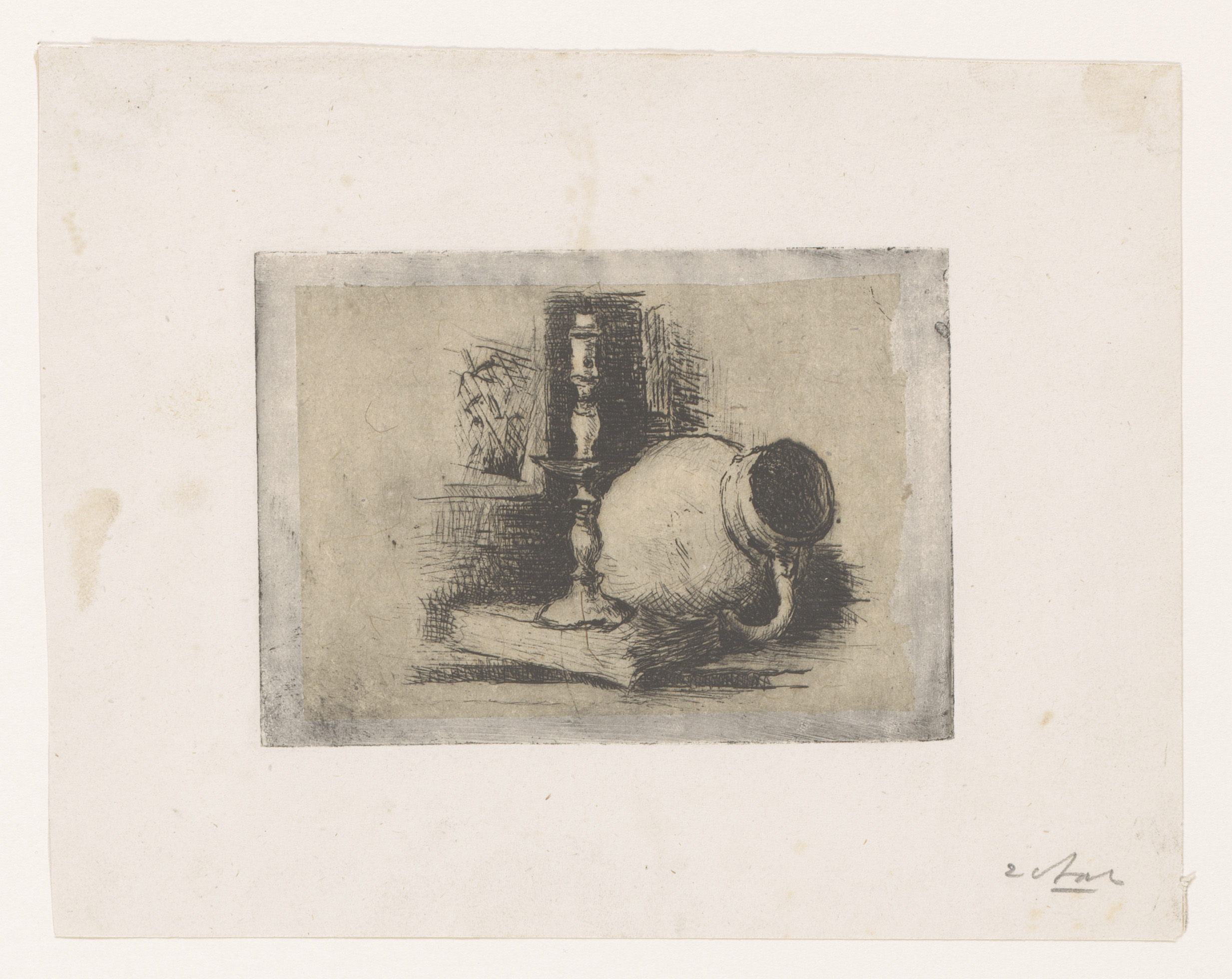 Stilleven met kruik en een kandelaar op een boek