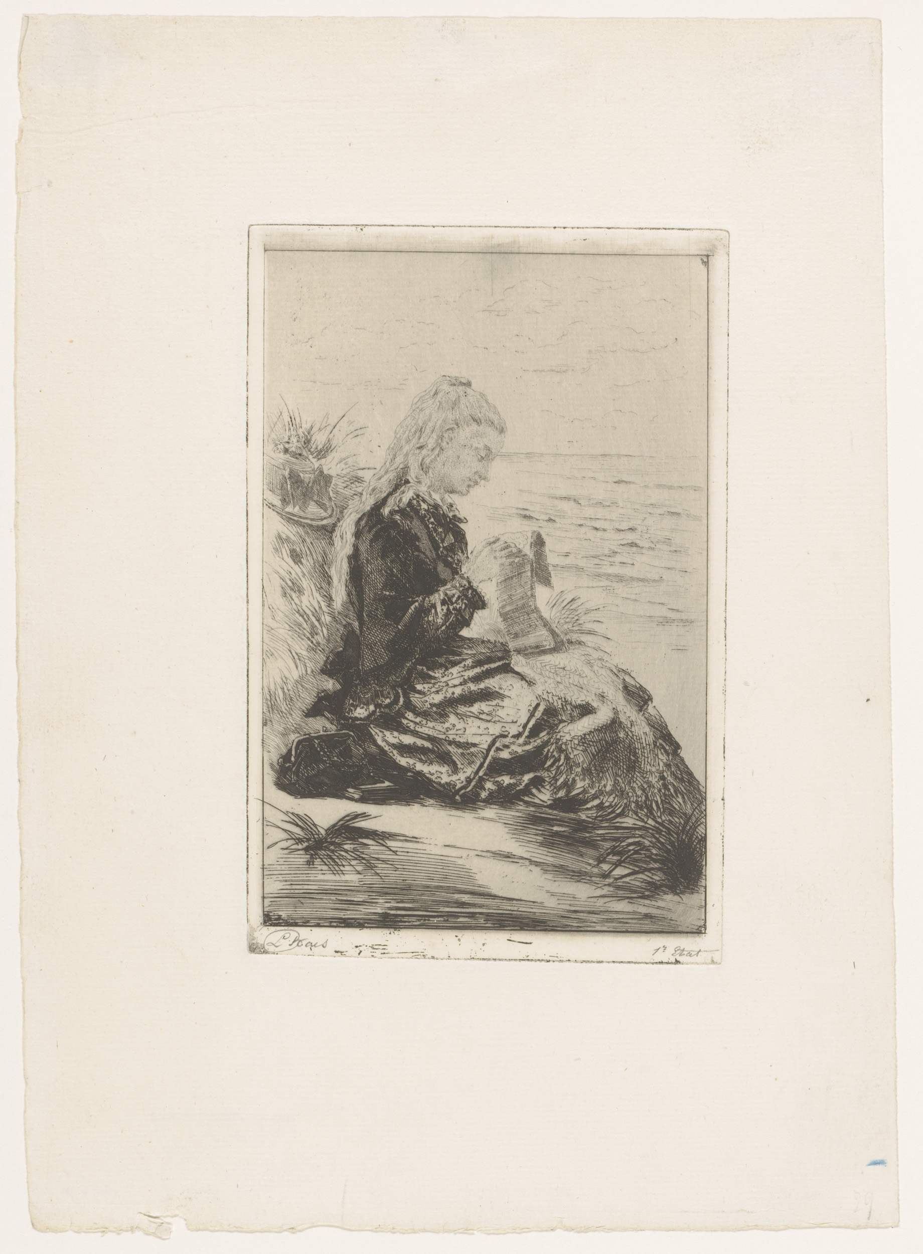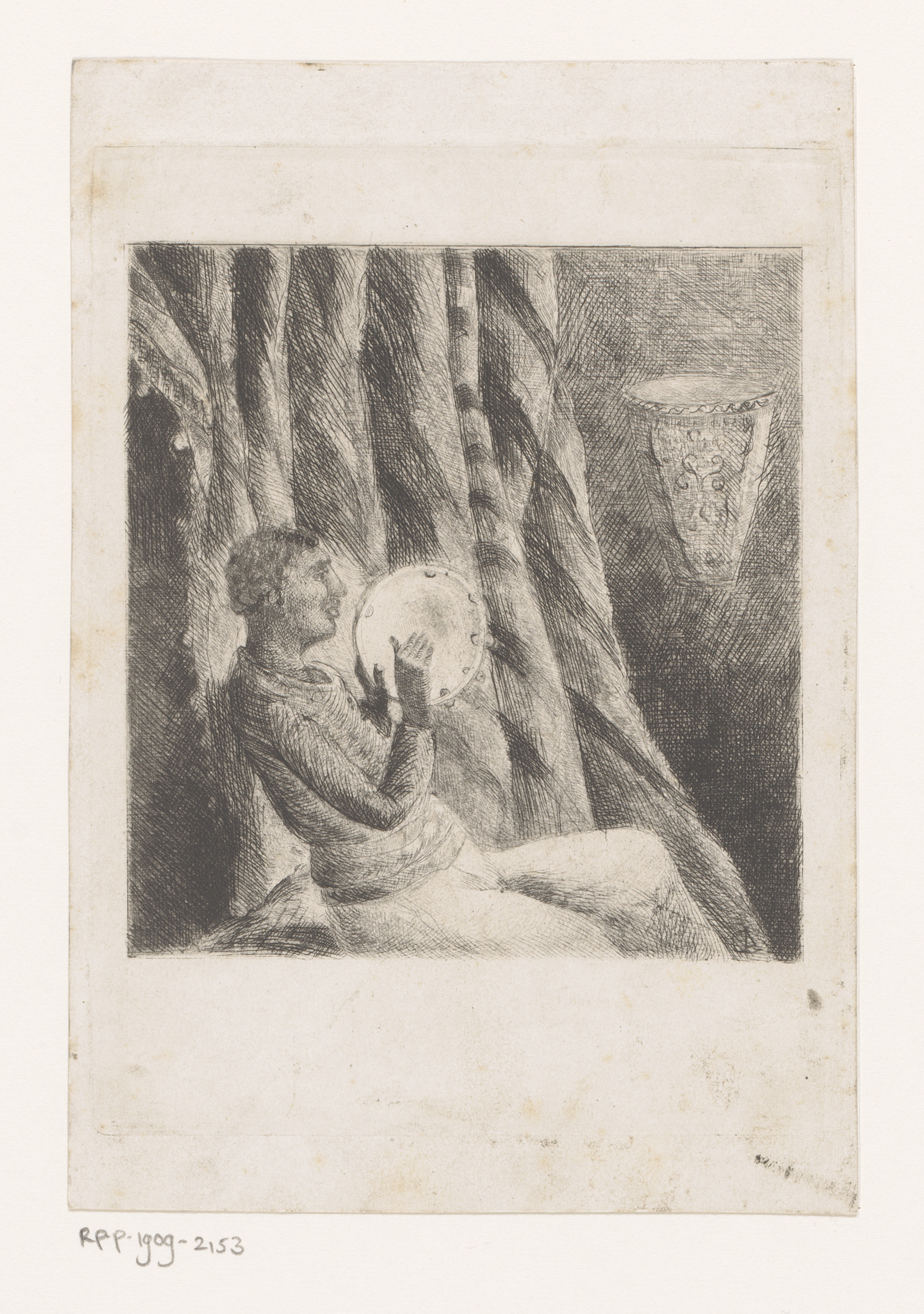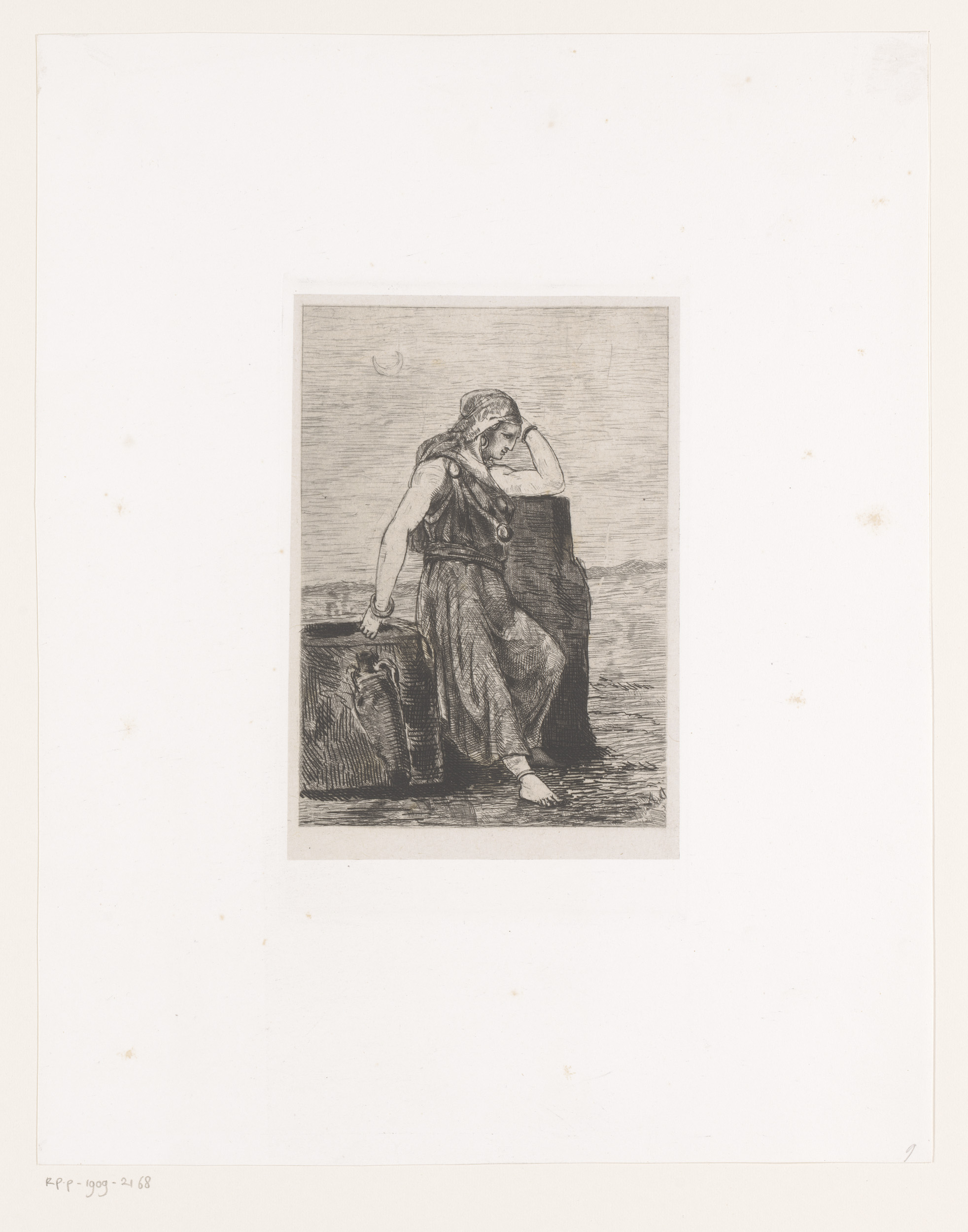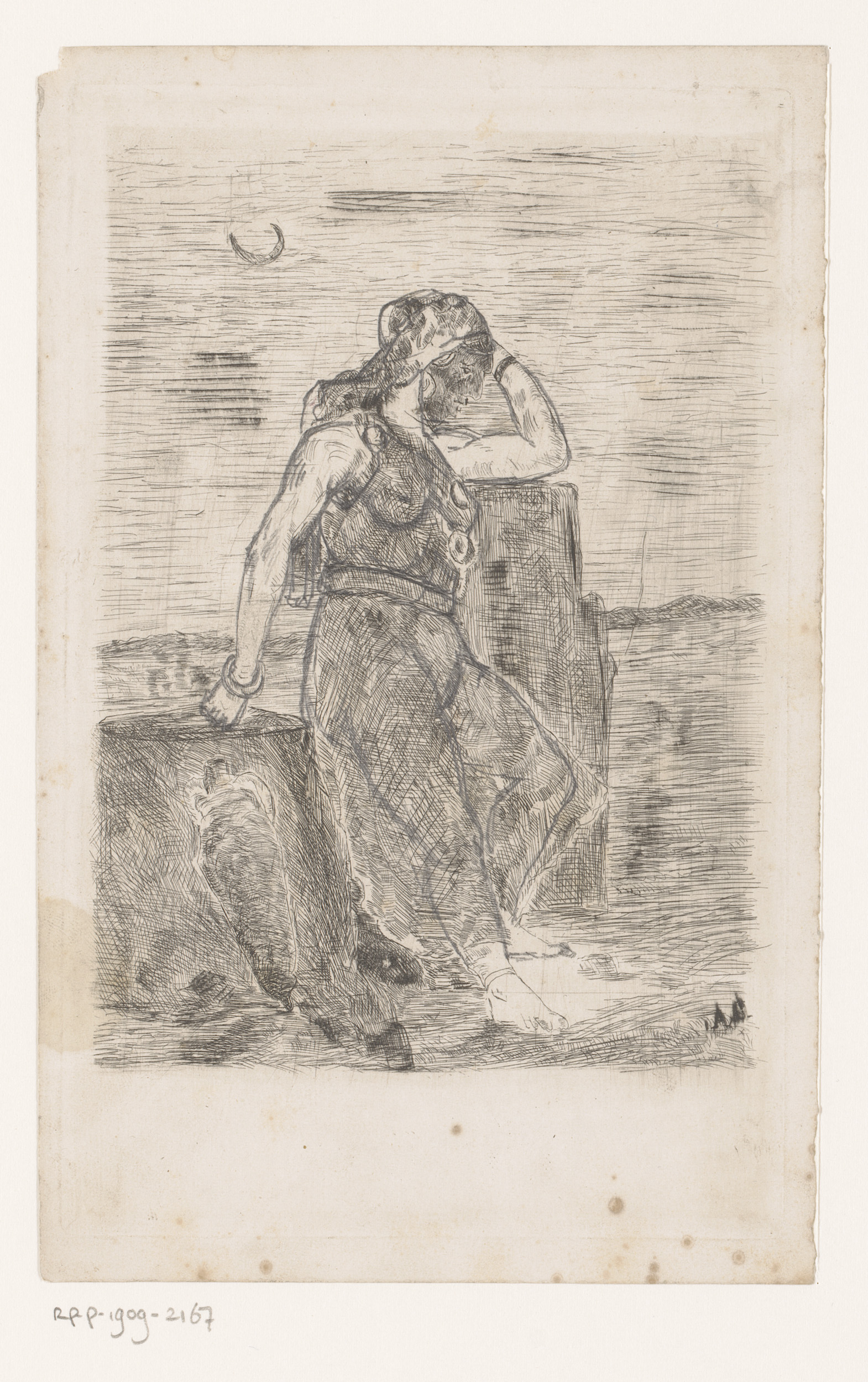 Slapende vrouw bij rotsblok, met naast haar een frui...