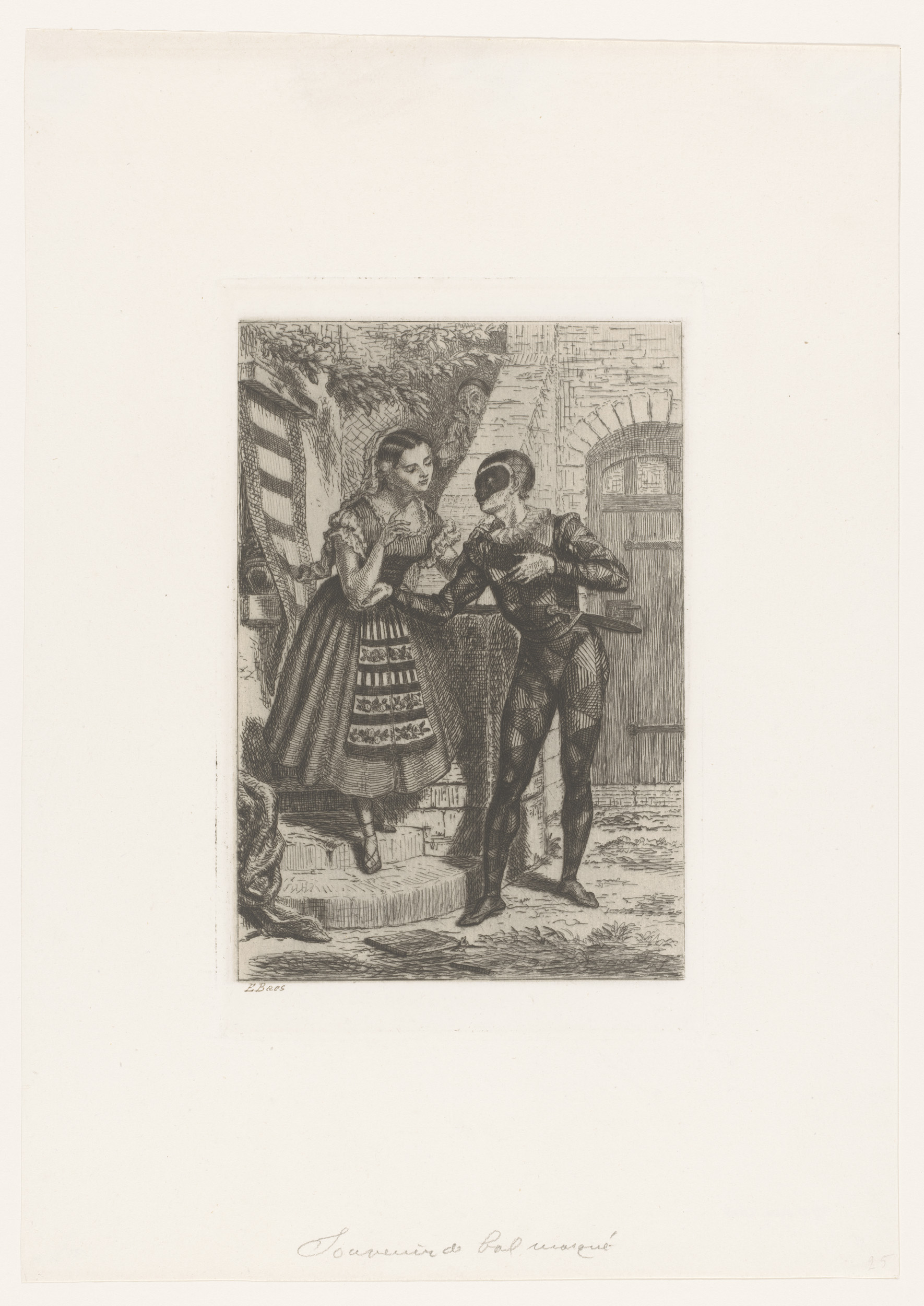 Harlekijn in domino maakt een meisje het hof, Pierro...