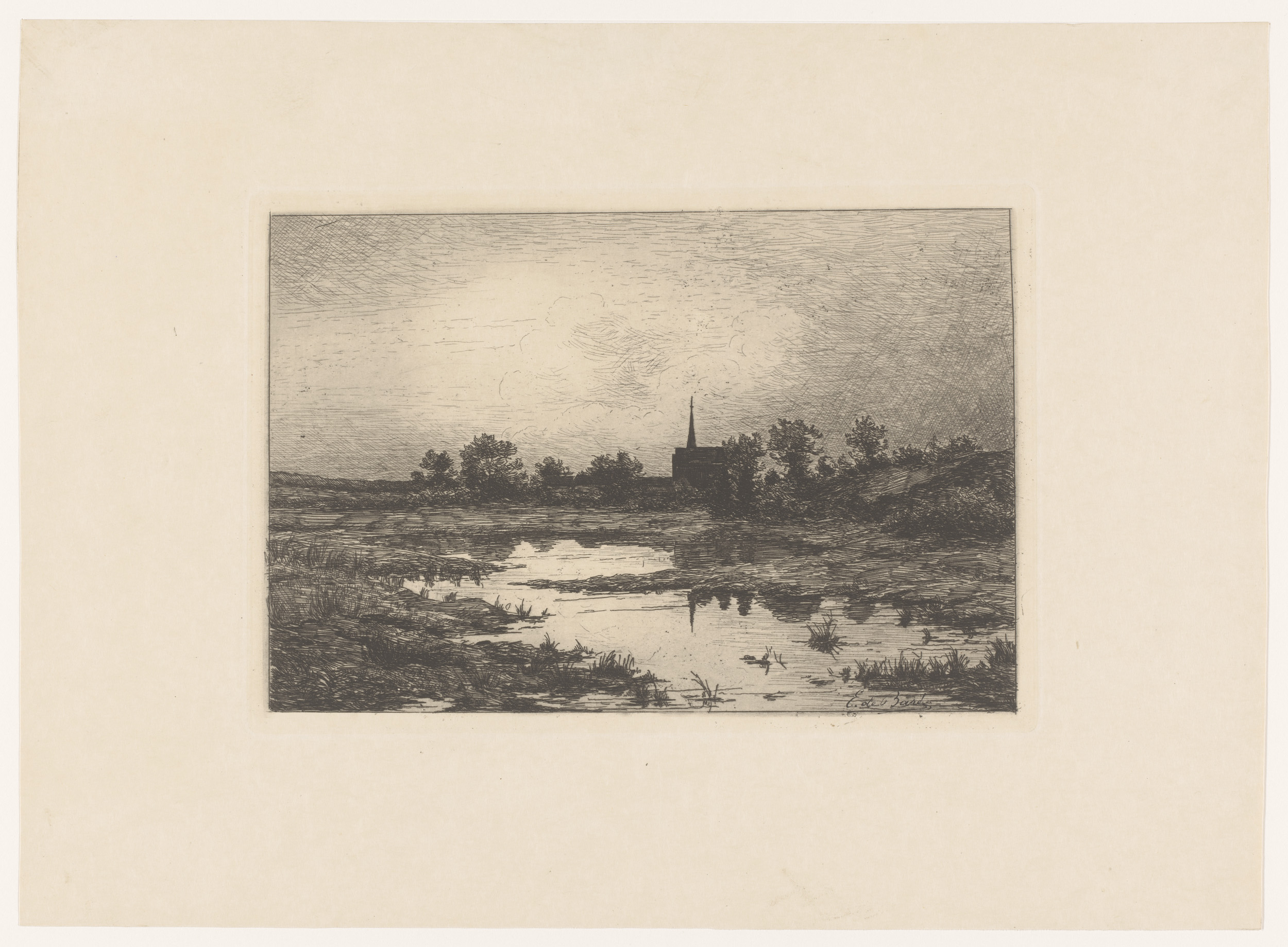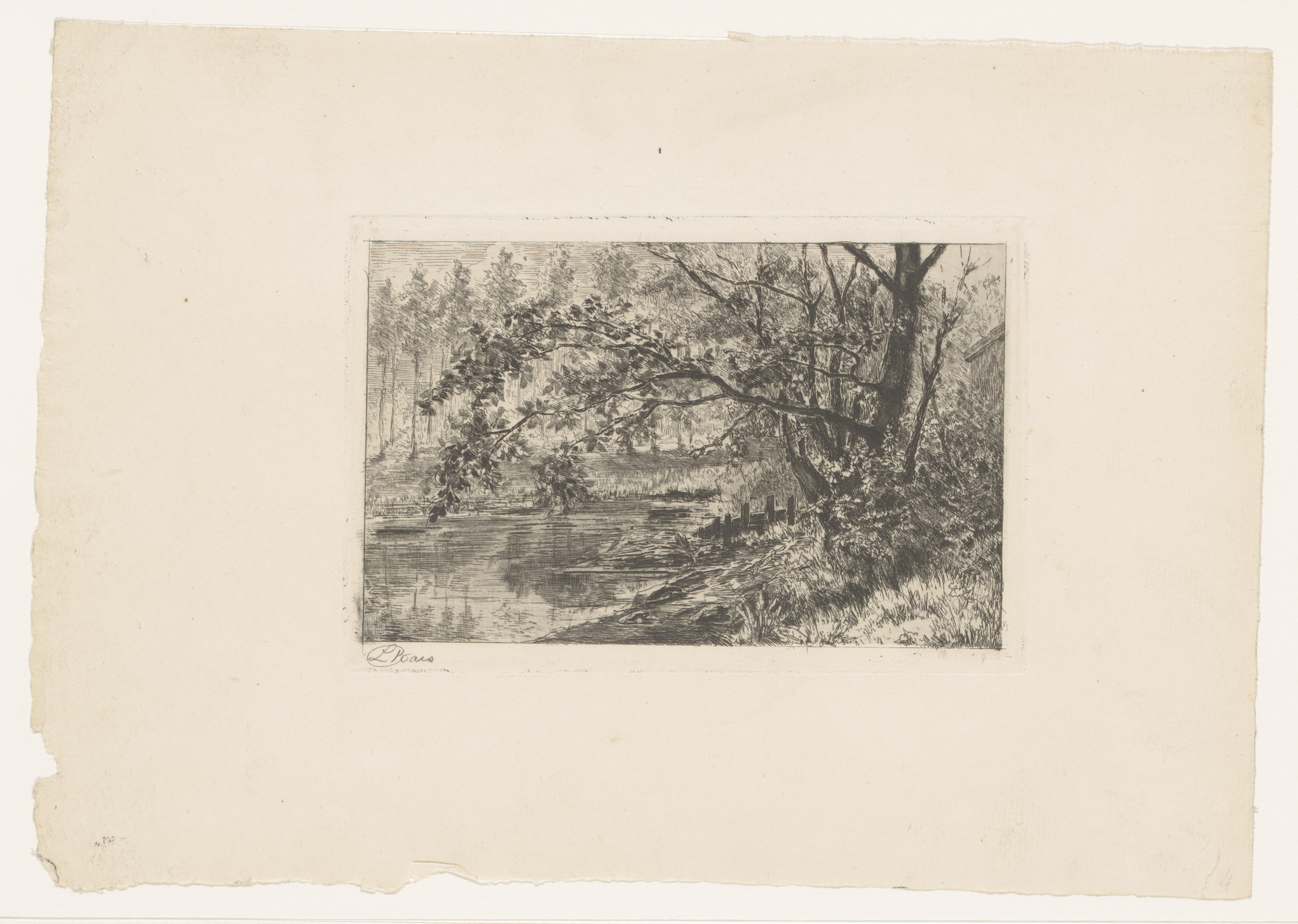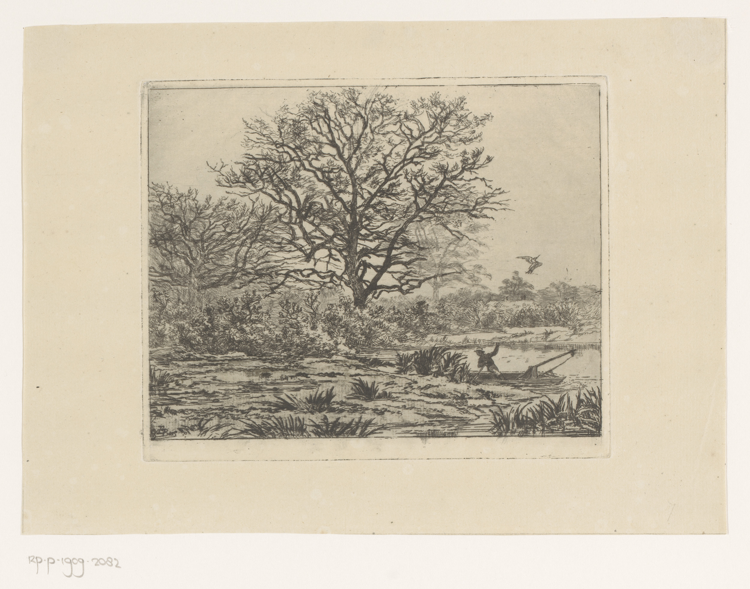 Boslandschap met een vijver met daarop een man in ee...