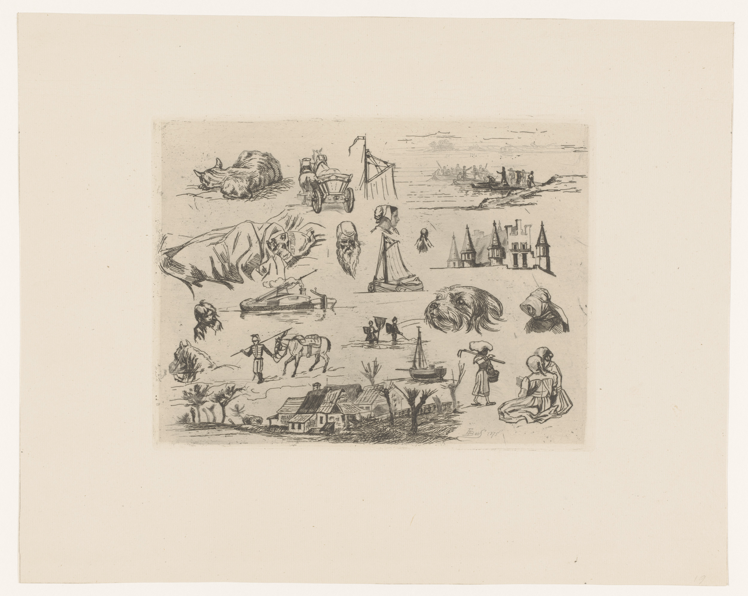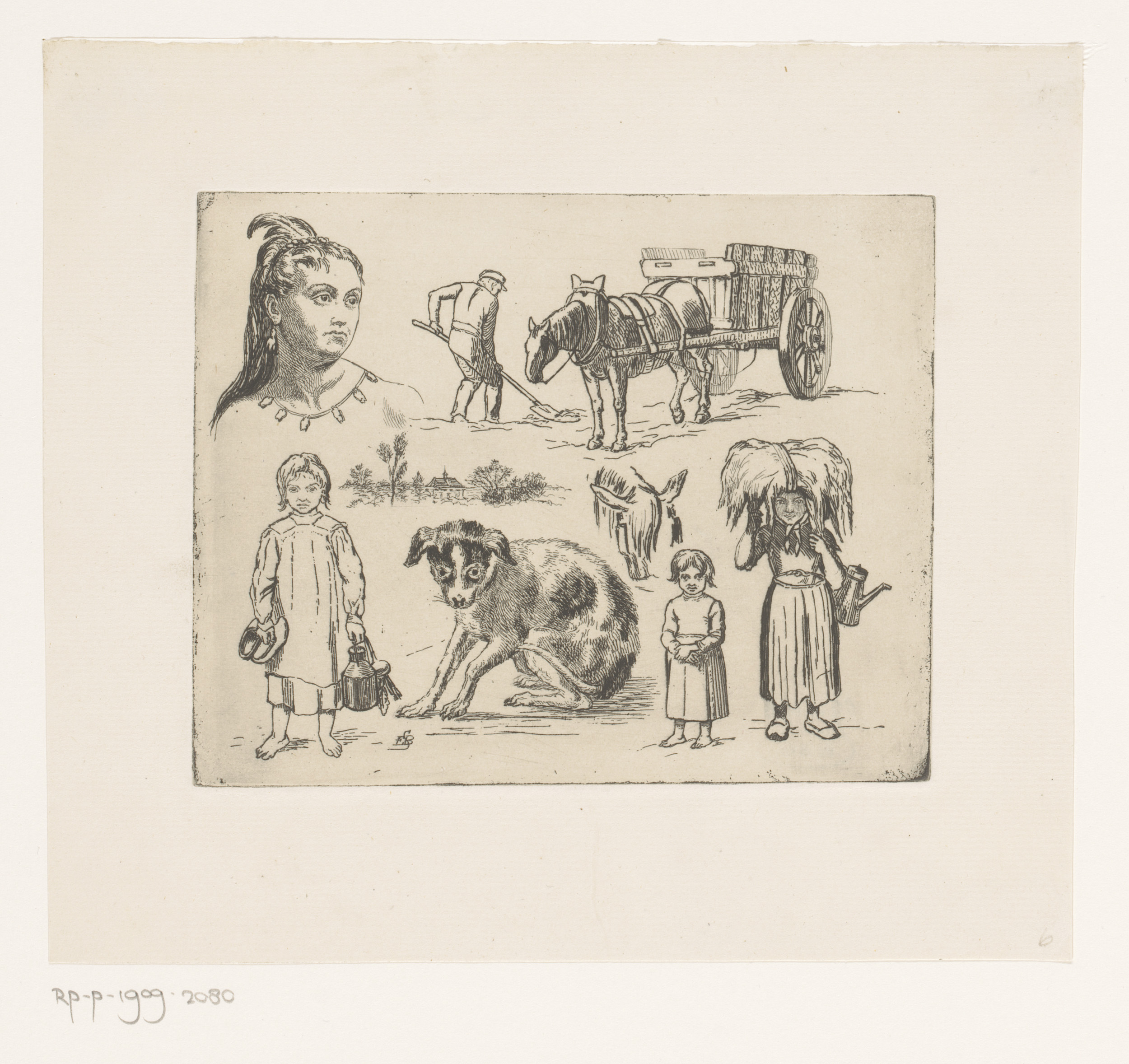 Studieblad met portretten, paard en wagen, een hond ...