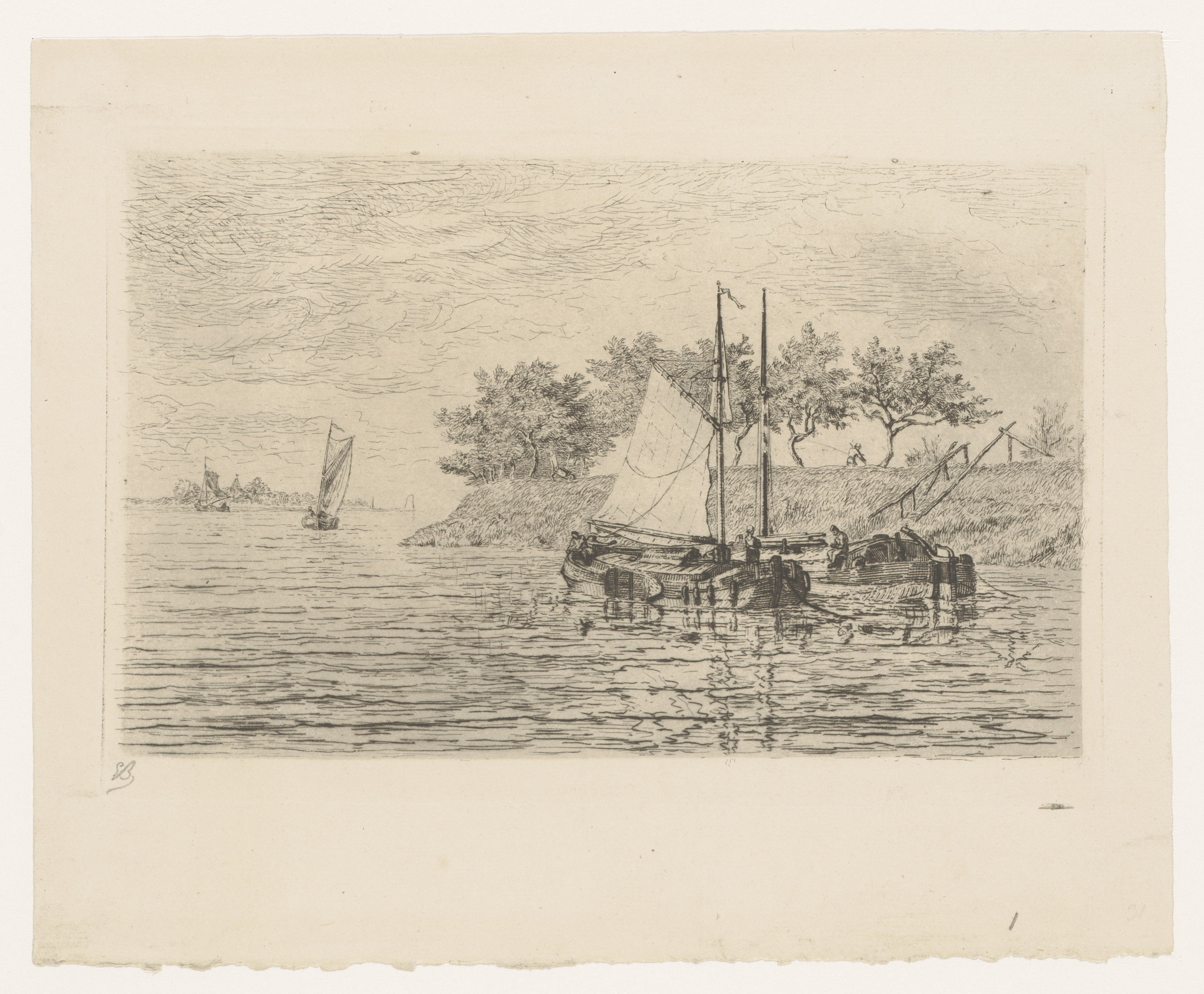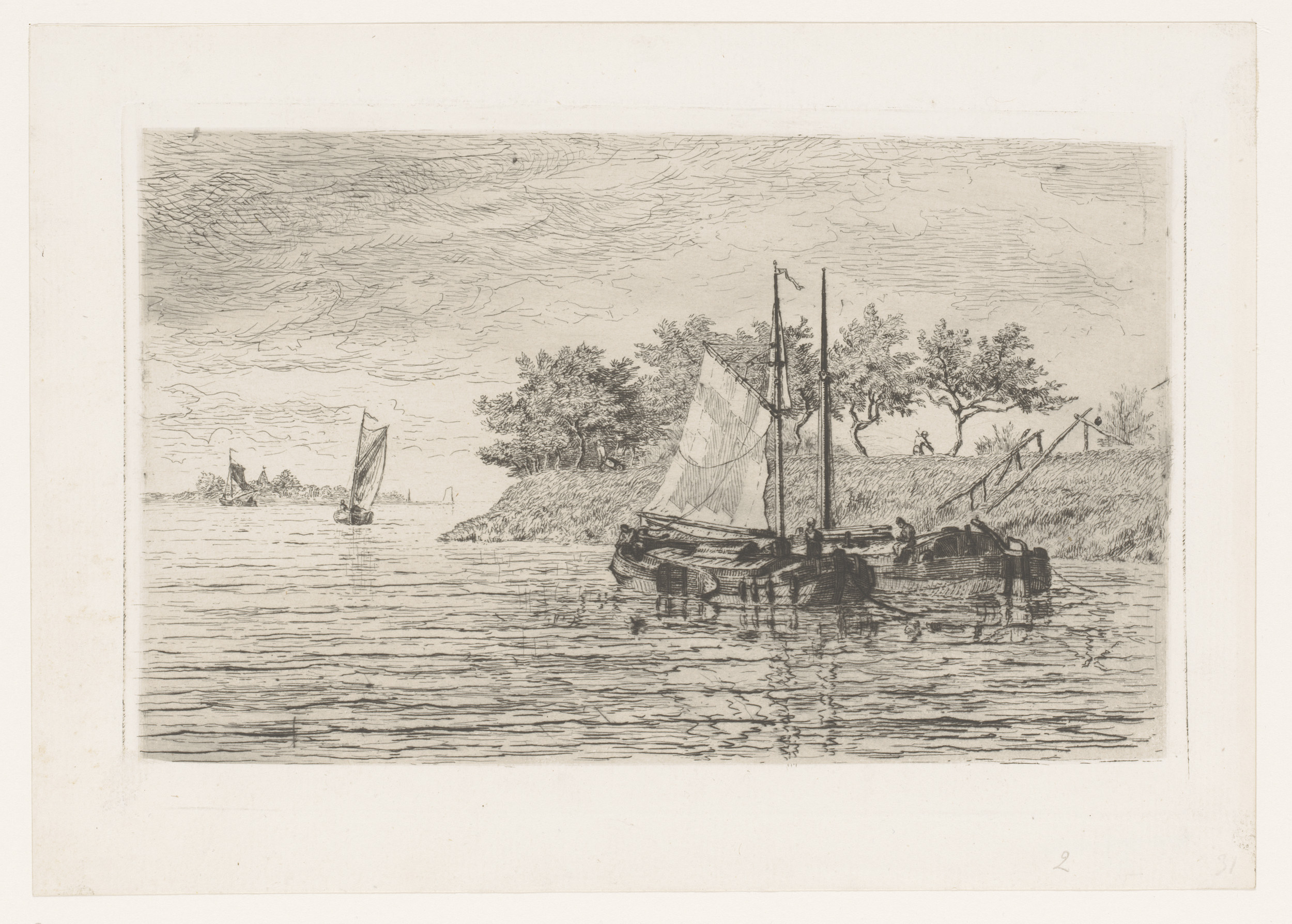 Zeilboten op een rivier, op de dijk staat een man te...