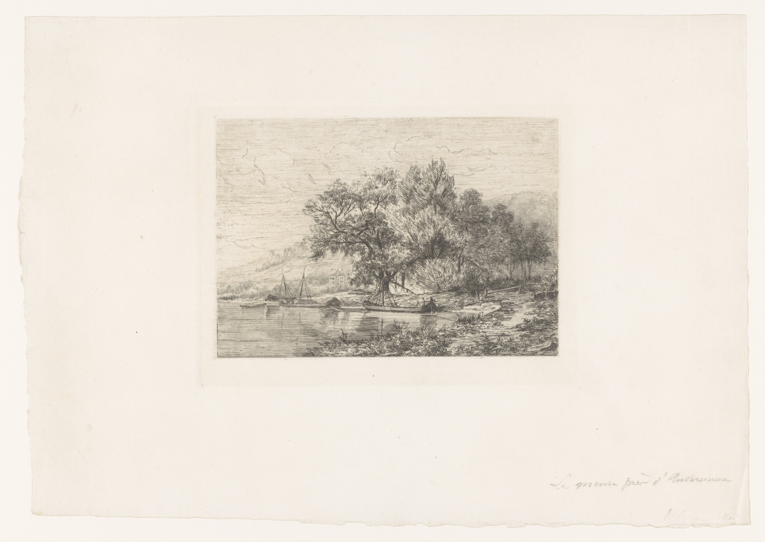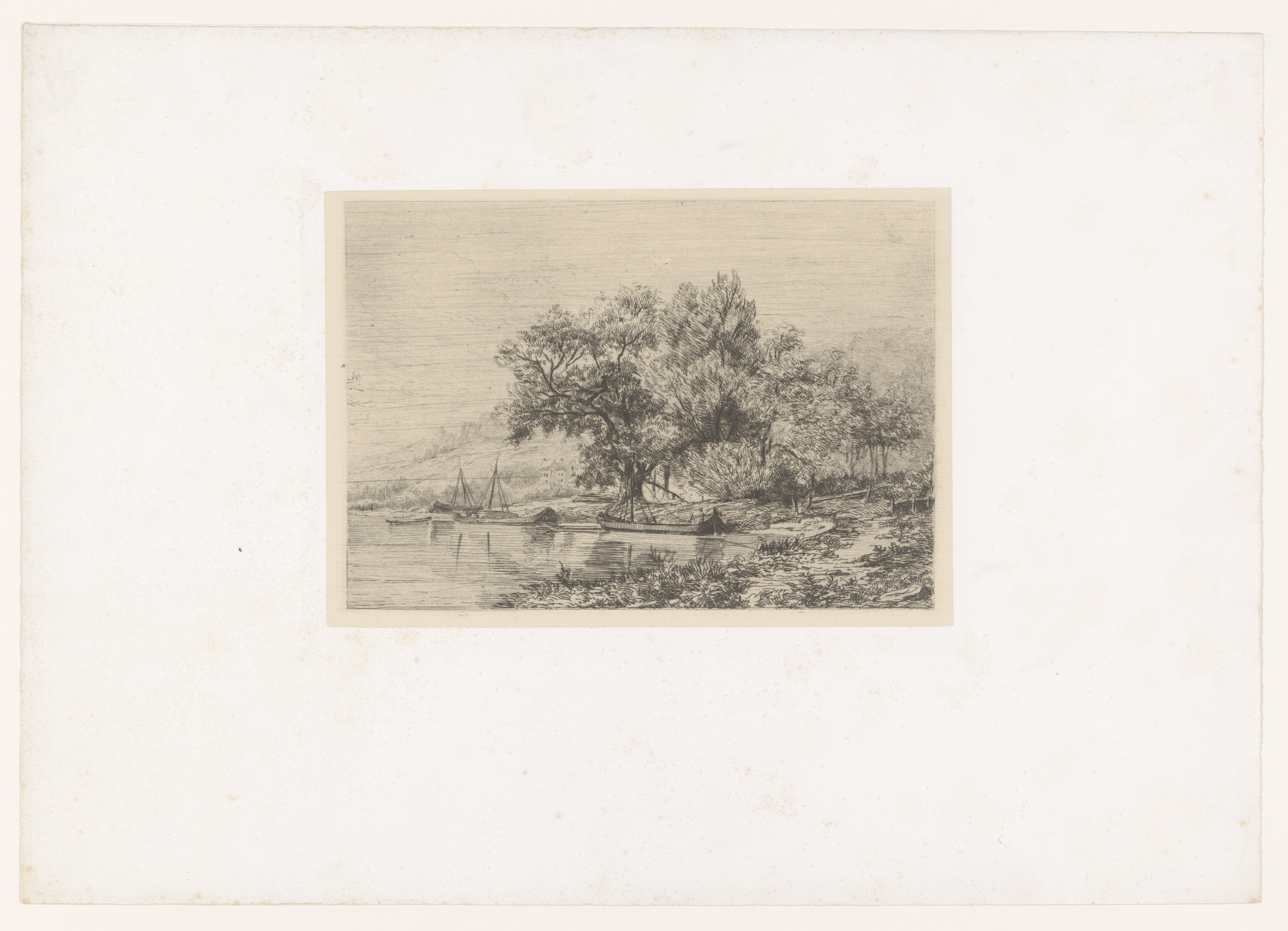 Gezicht op de Maas met enkele boten en een heuvel op...