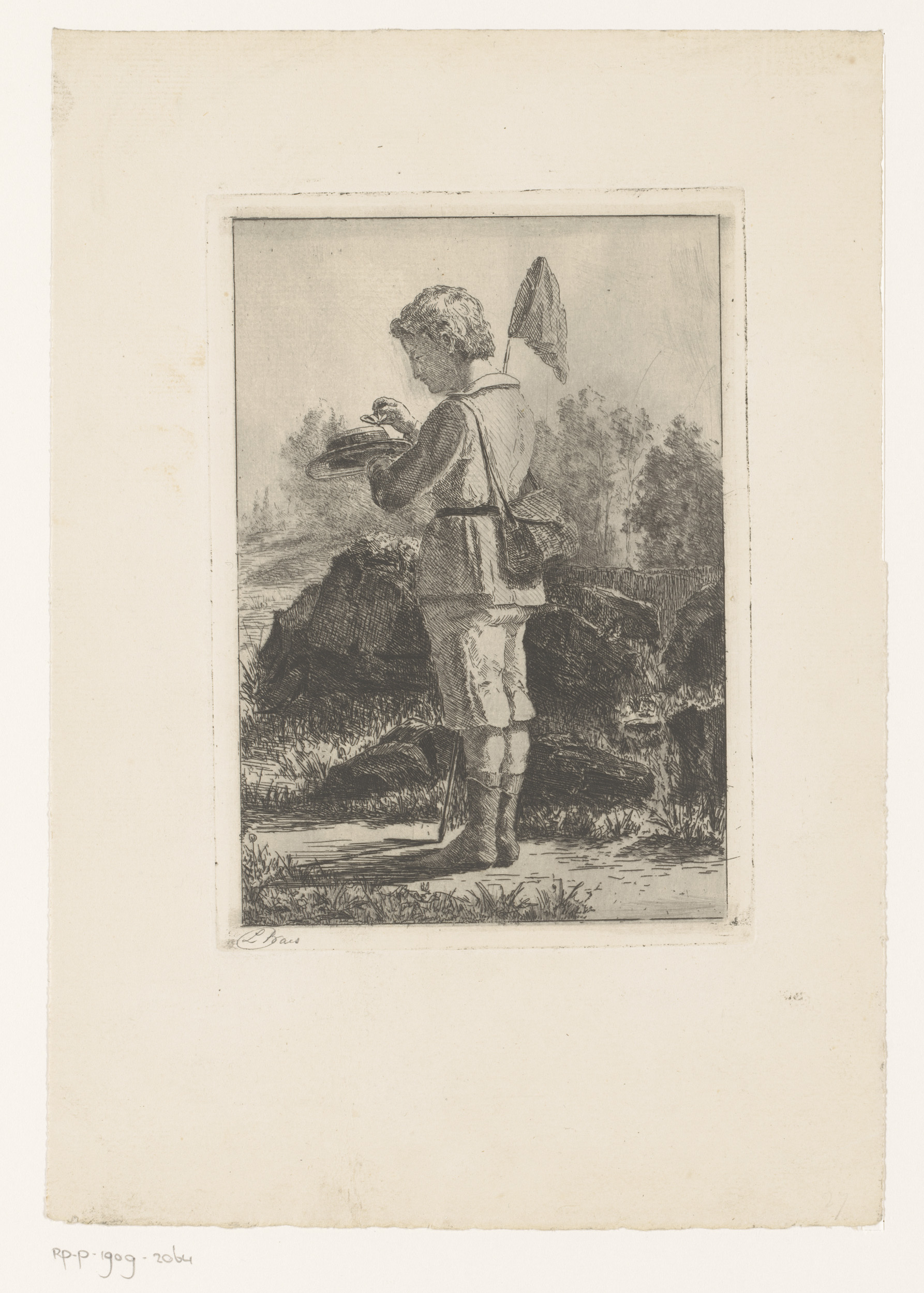 Jongen met een vlindernet steekt een vlinder op zijn...