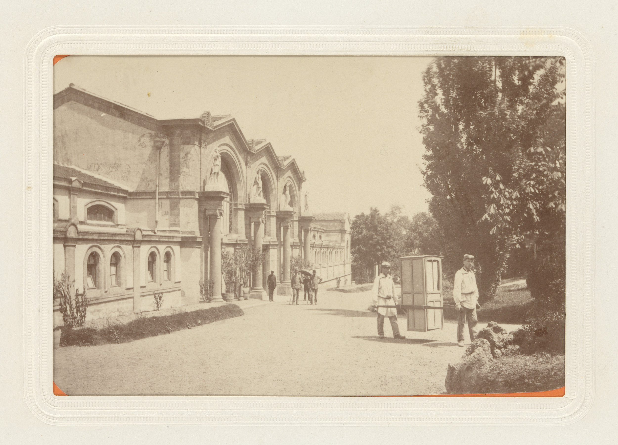 Twee mannen dragen een draagstoel buiten het badhuis...