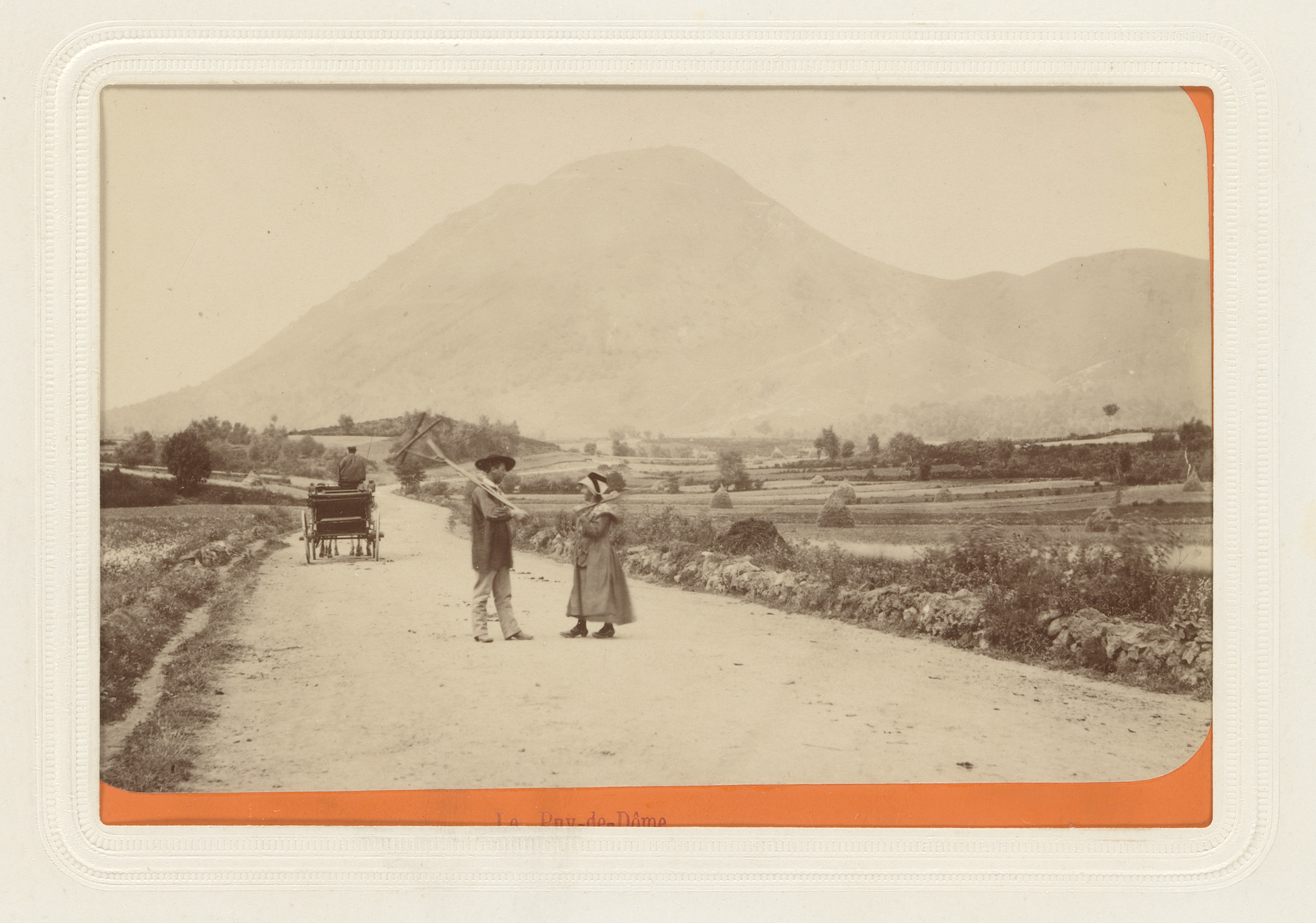 Twee mensen en een rijtuig op een weg door een dal i...