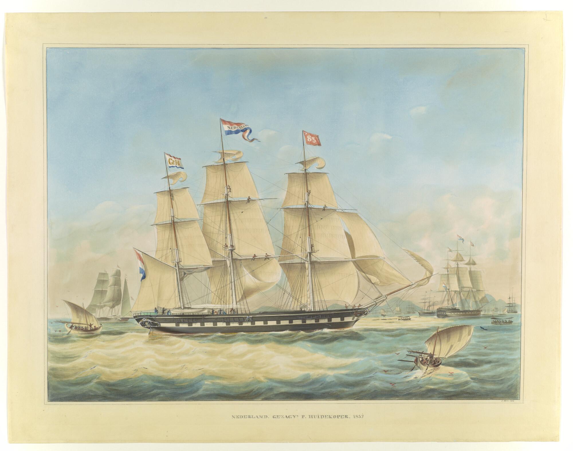 Het fregatschip Nederland op de rede van Batavia
