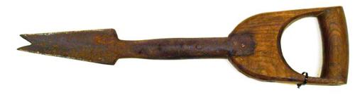 Bietenrooispade van metaal met een korte houten stee...