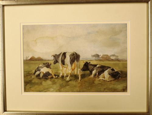 Aquarel met als voorstelling een landschap met koeie...