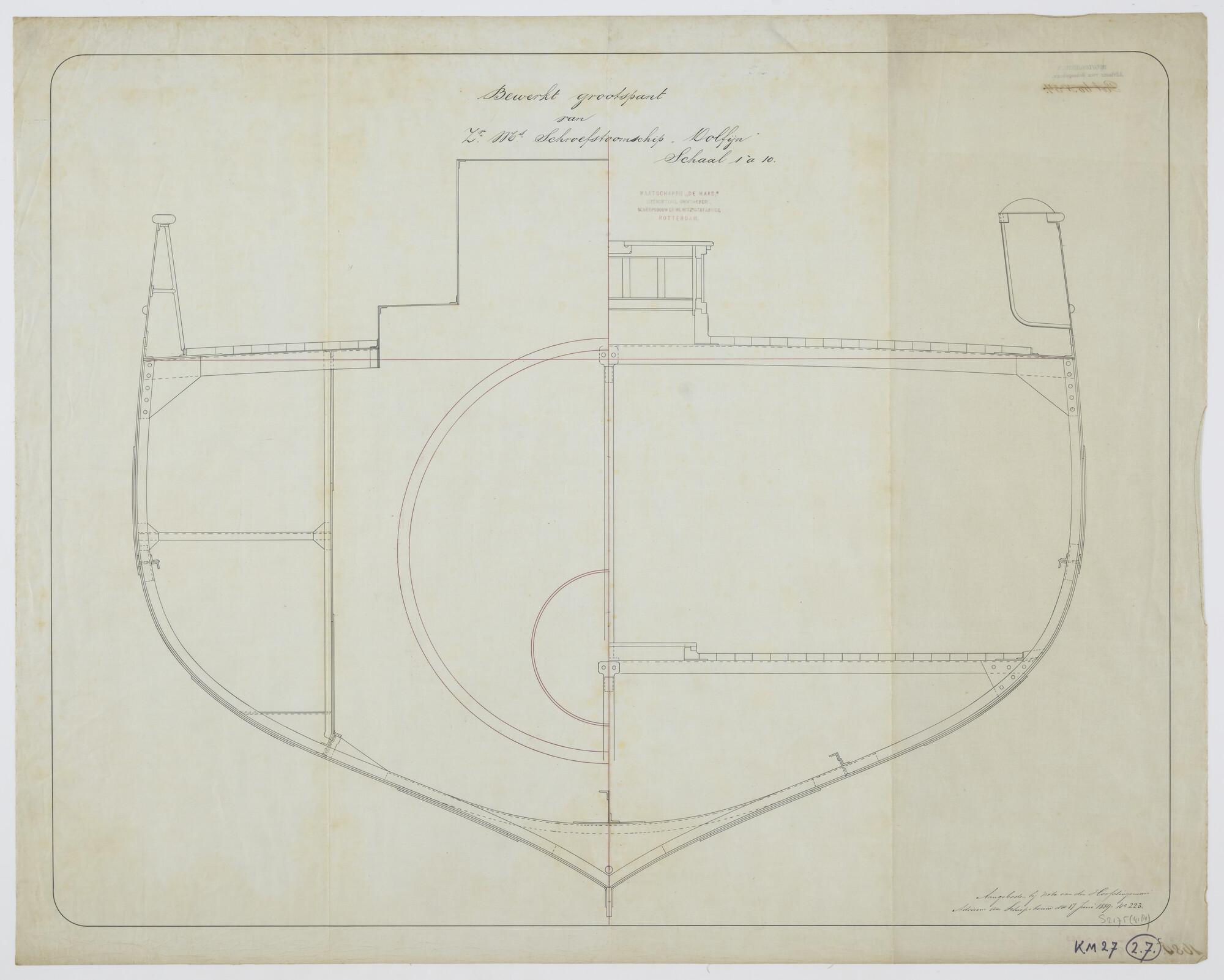 Langsdoorsnede met tuigage van het stoomschip met ze...