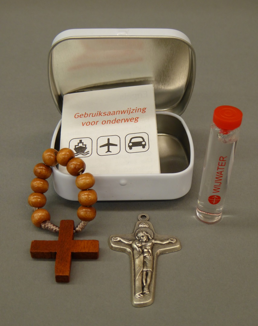 Wit blikje met rozenkrans, wijwaterflesje, vingerroz...