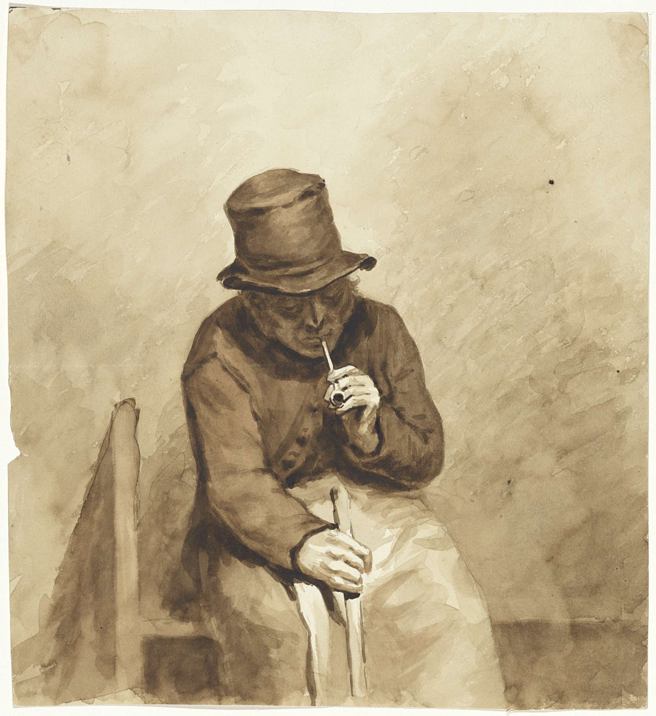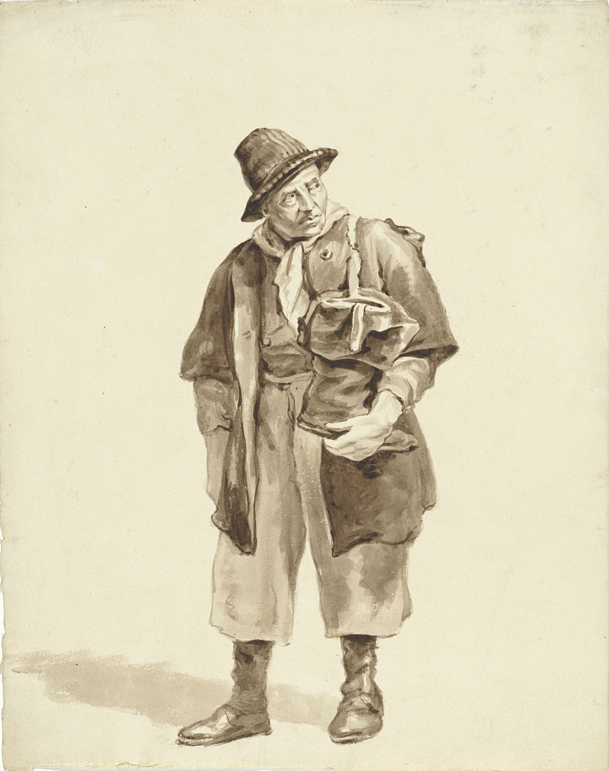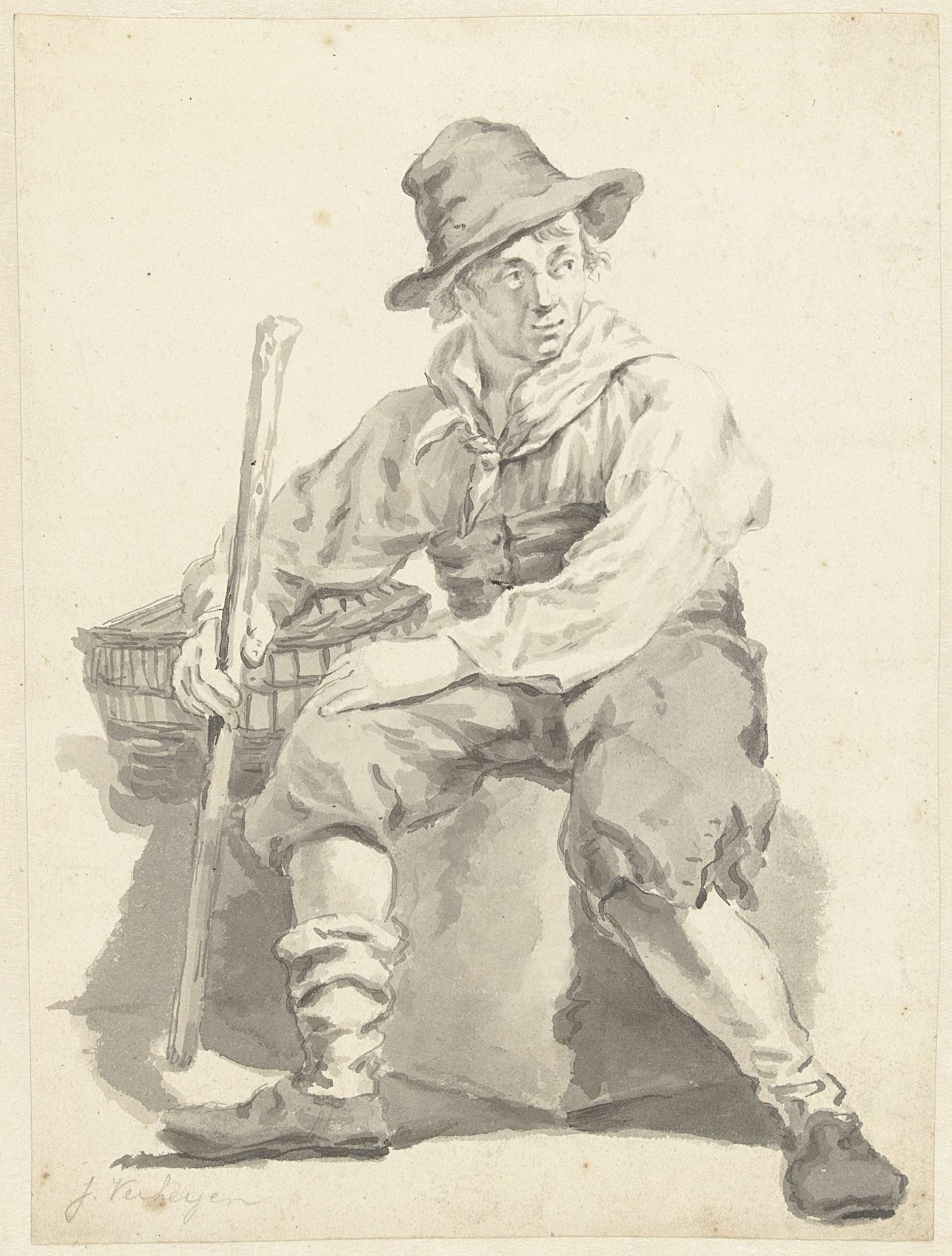 Zittende man met hoed, een stok in de hand en een mand