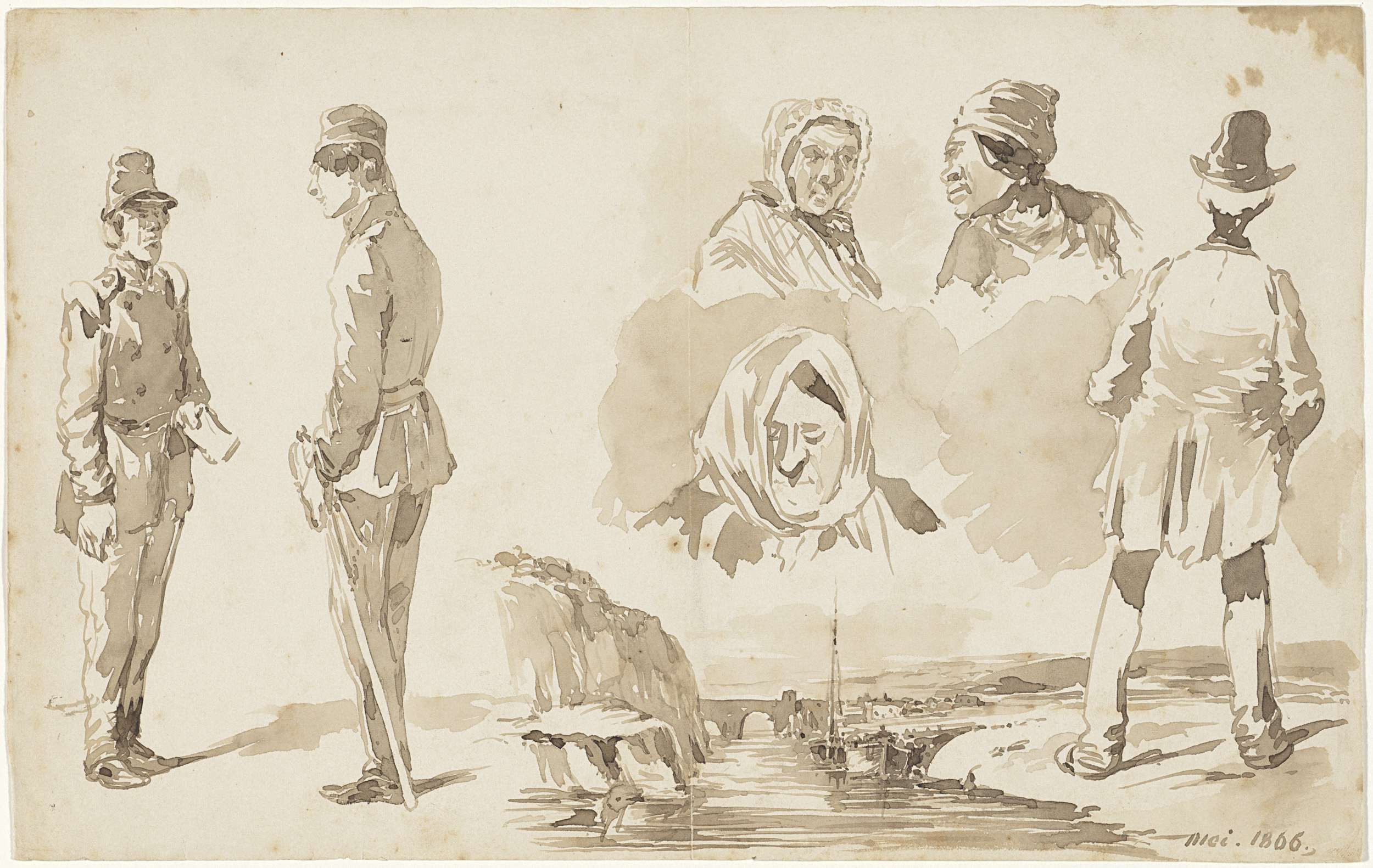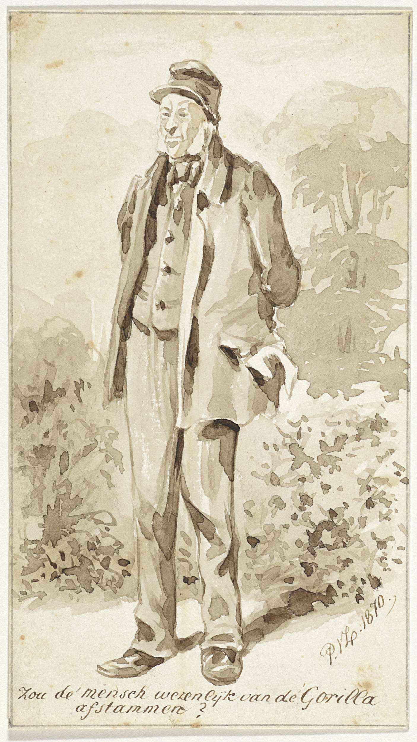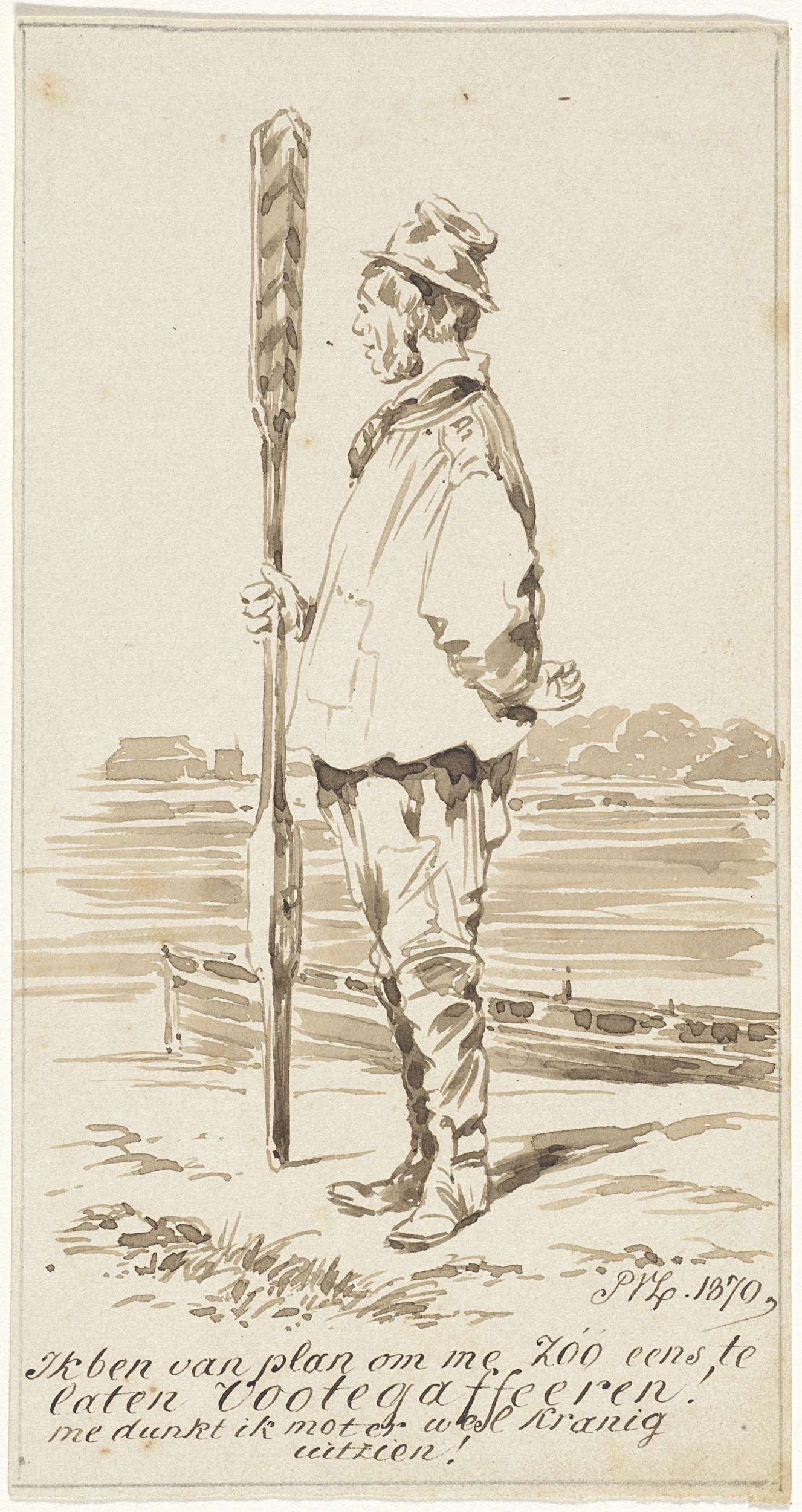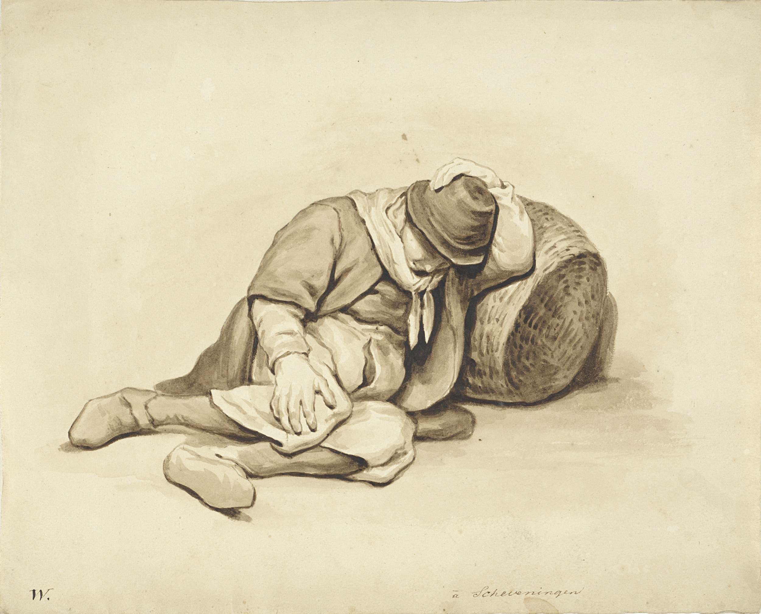 Zittende man met hoed, een stok in de hand en een mand