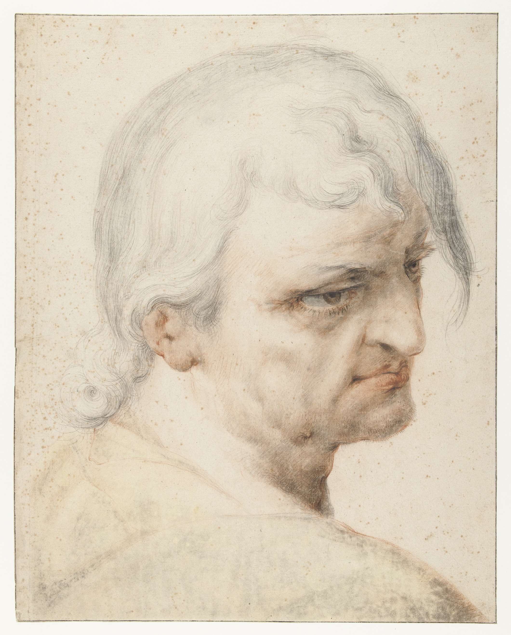 Kop van een man die over zijn rechter schouder kijkt...