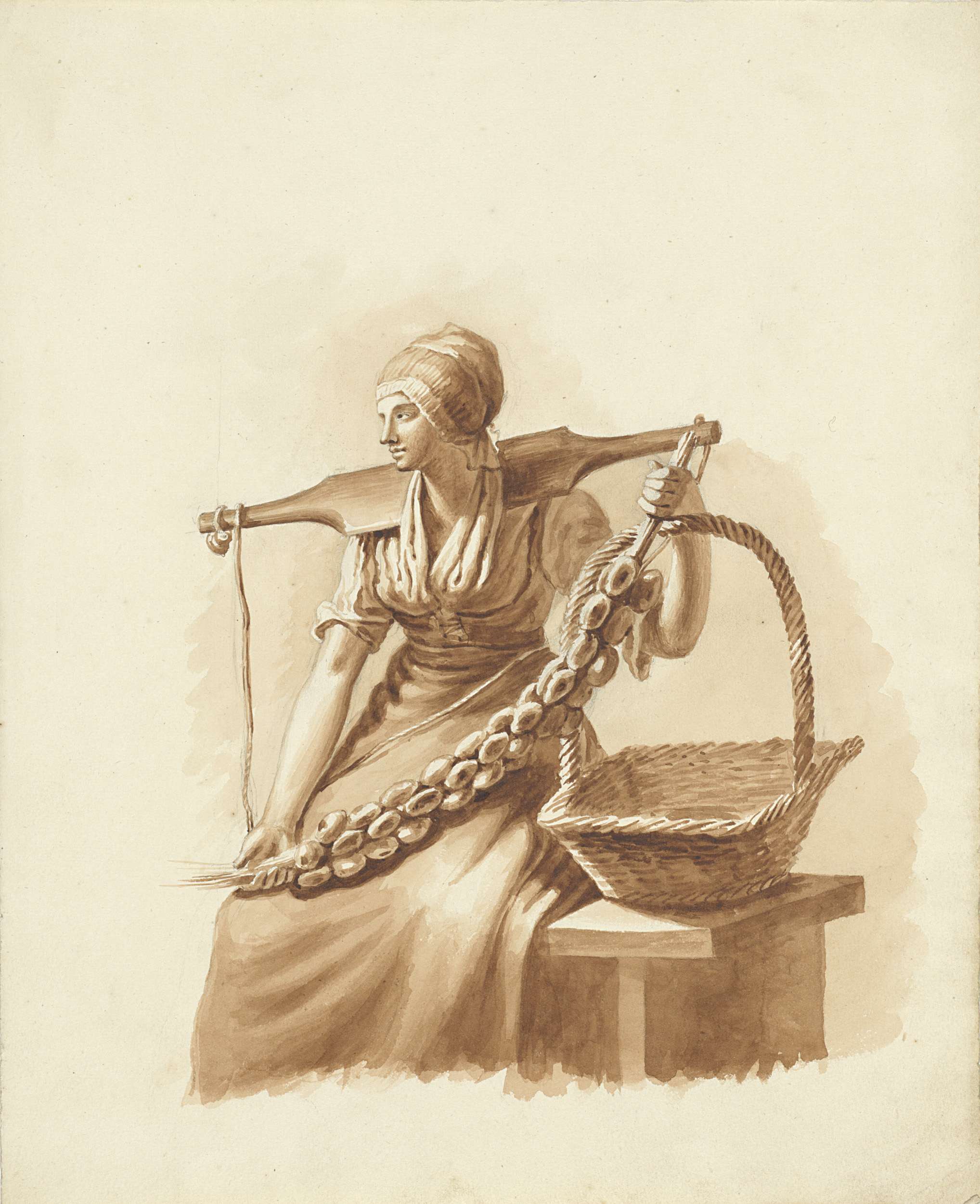 Zittende vrouw met een juk en een mand