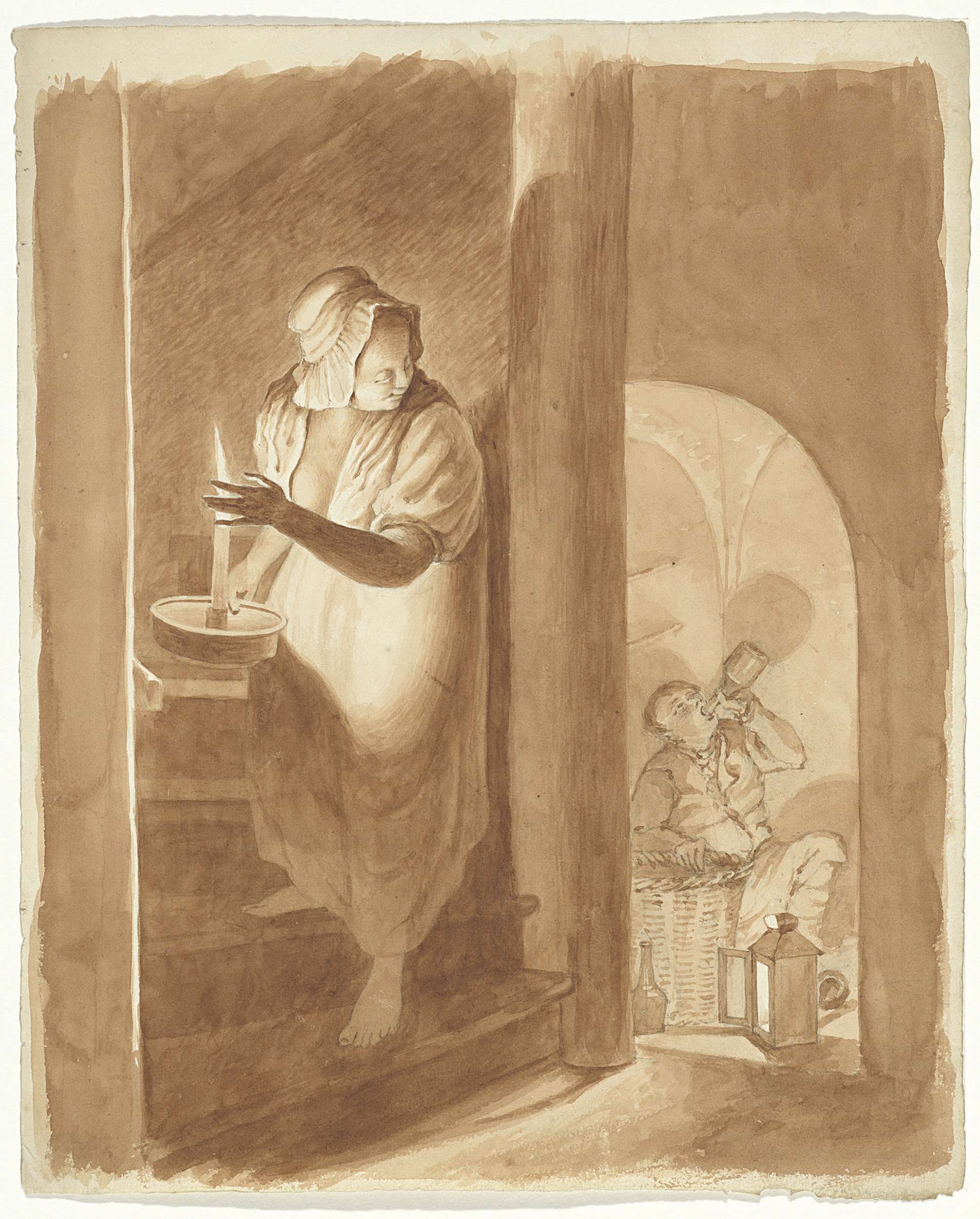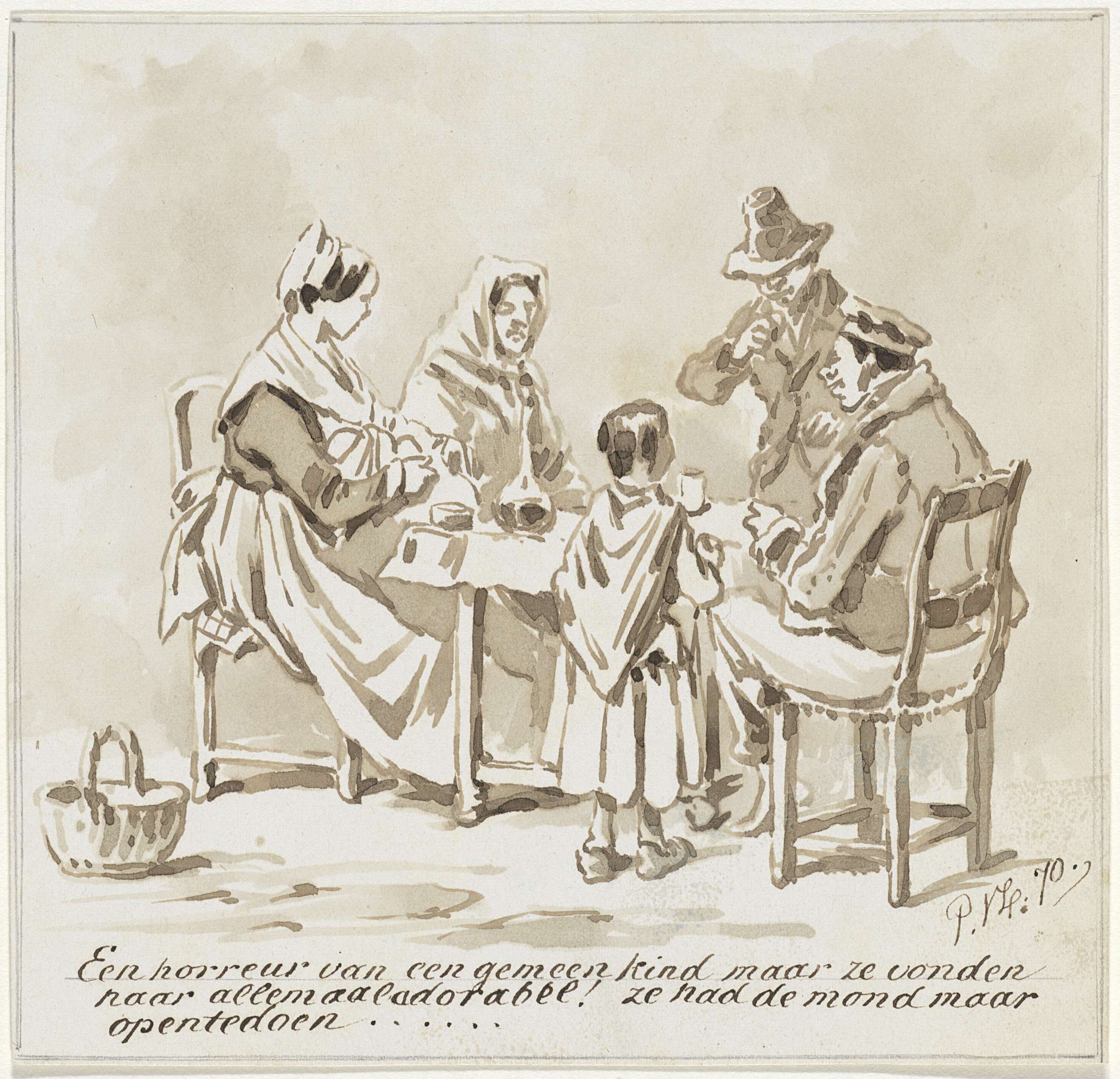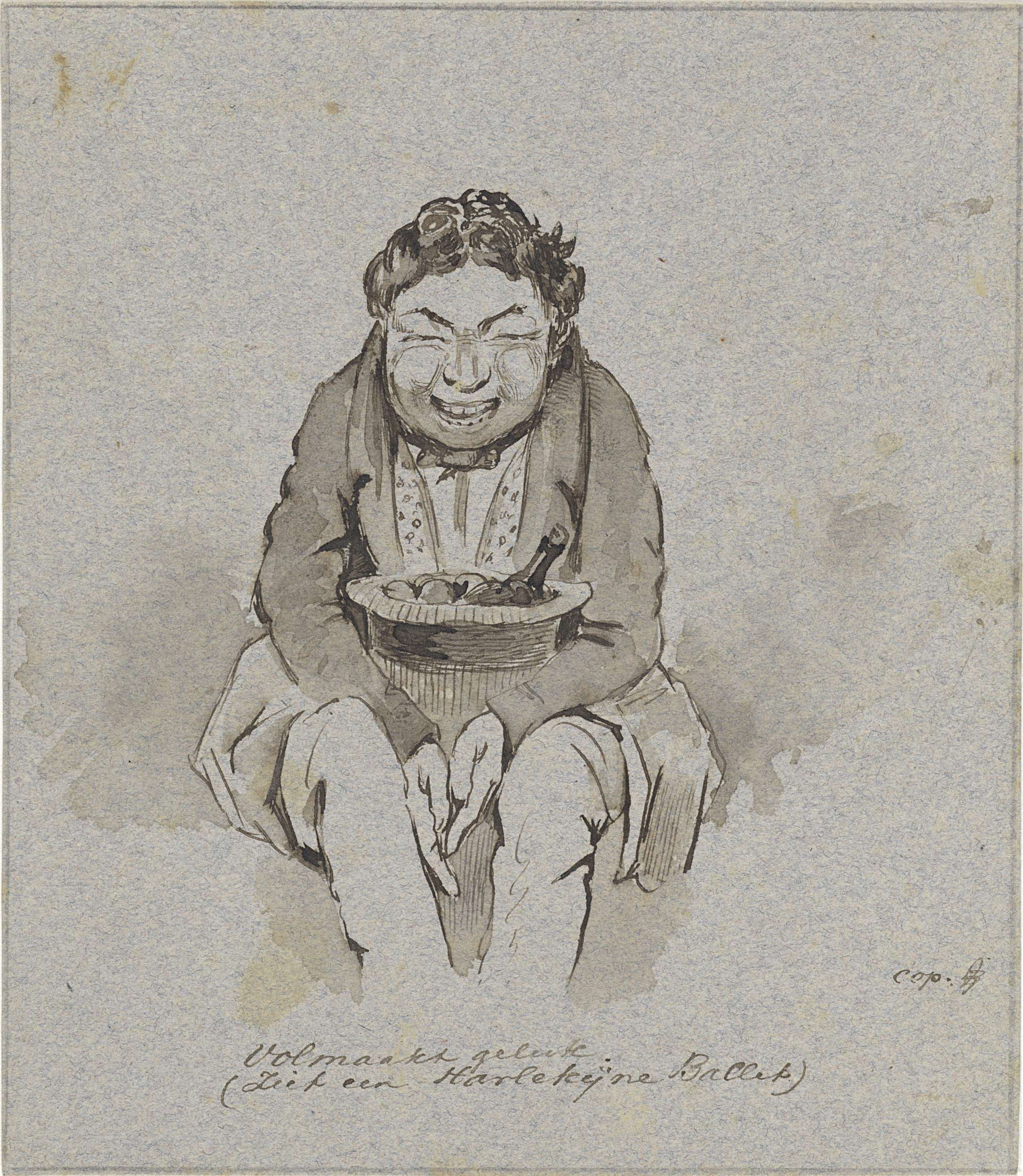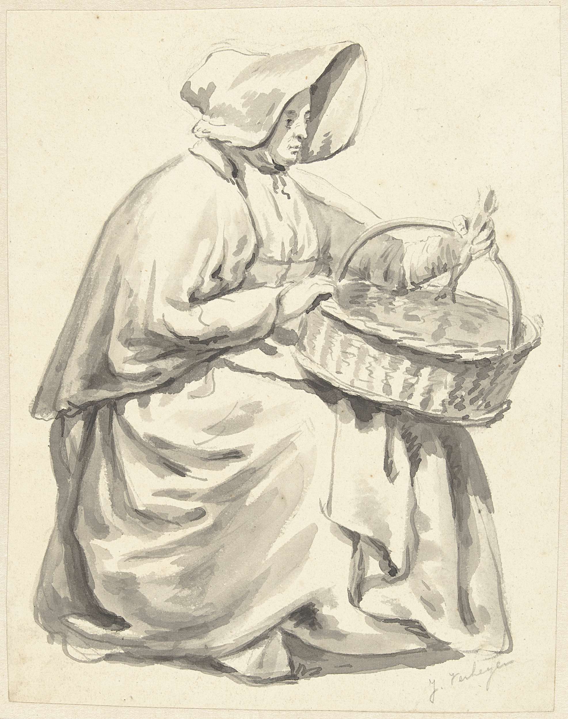 Zittende vrouw met wijde kap en een mand op schoot, ...