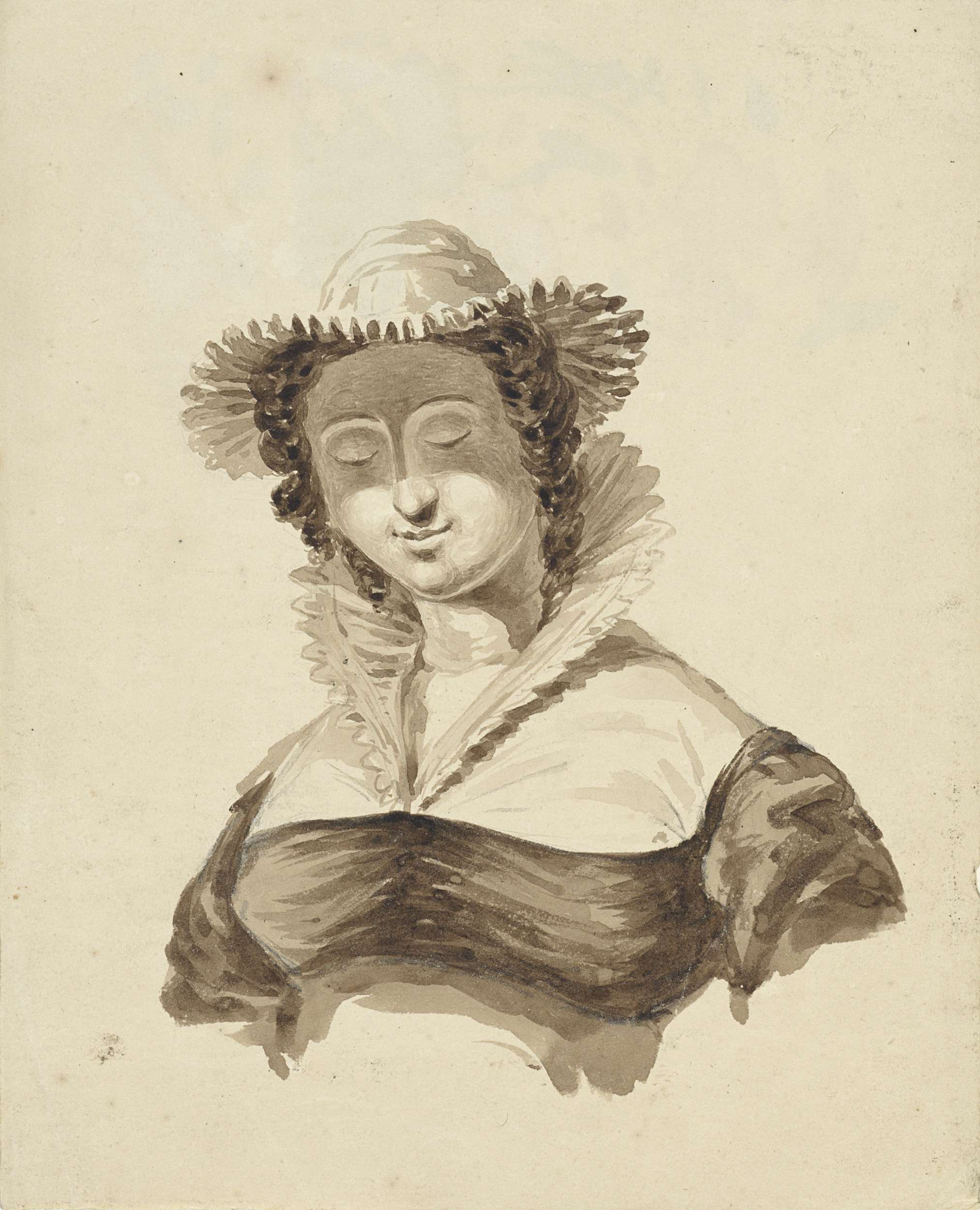 Buste van een vrouw met hoed en opstaande kraag