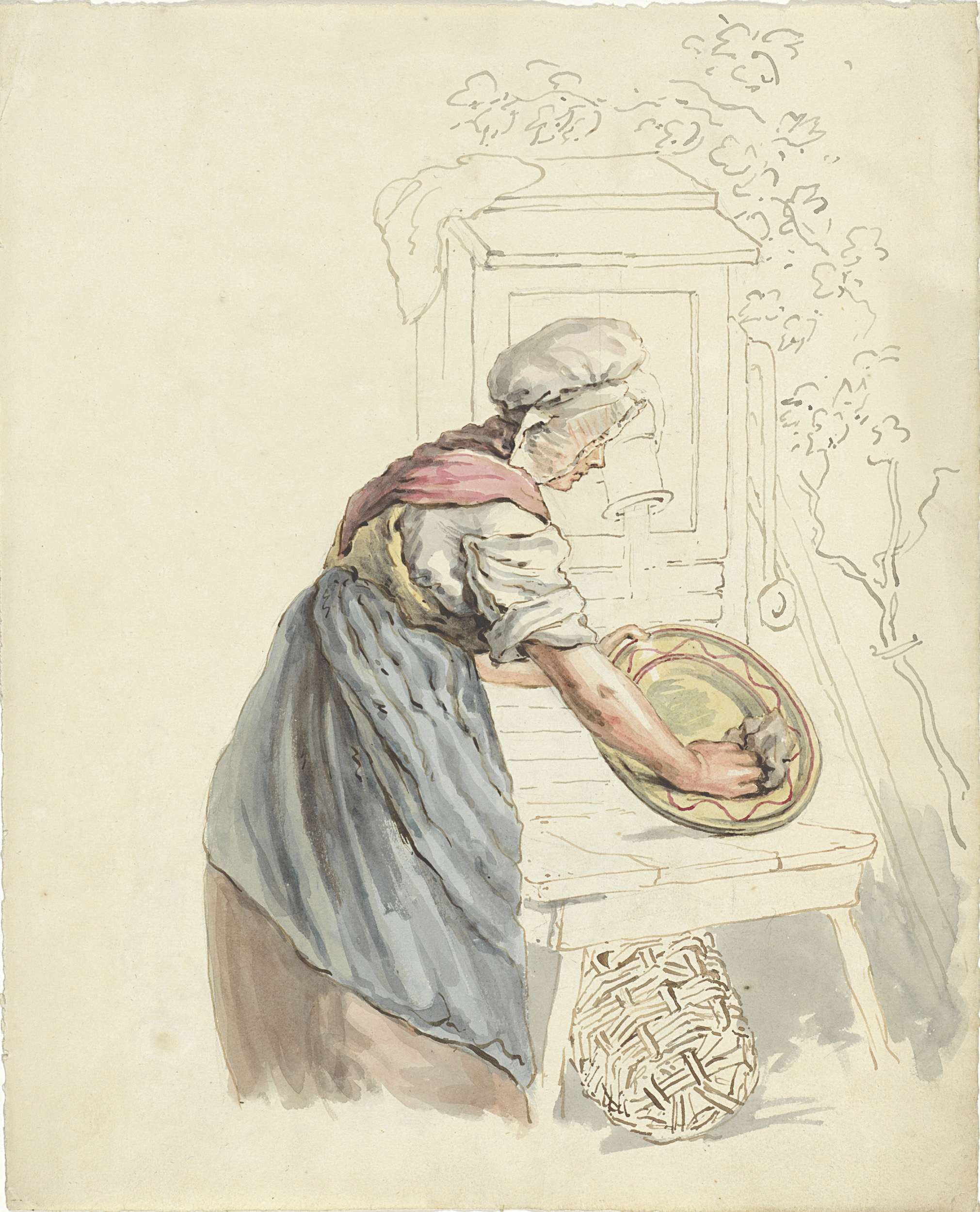Dienstmeid die bij een waterpomp een schaal afwast