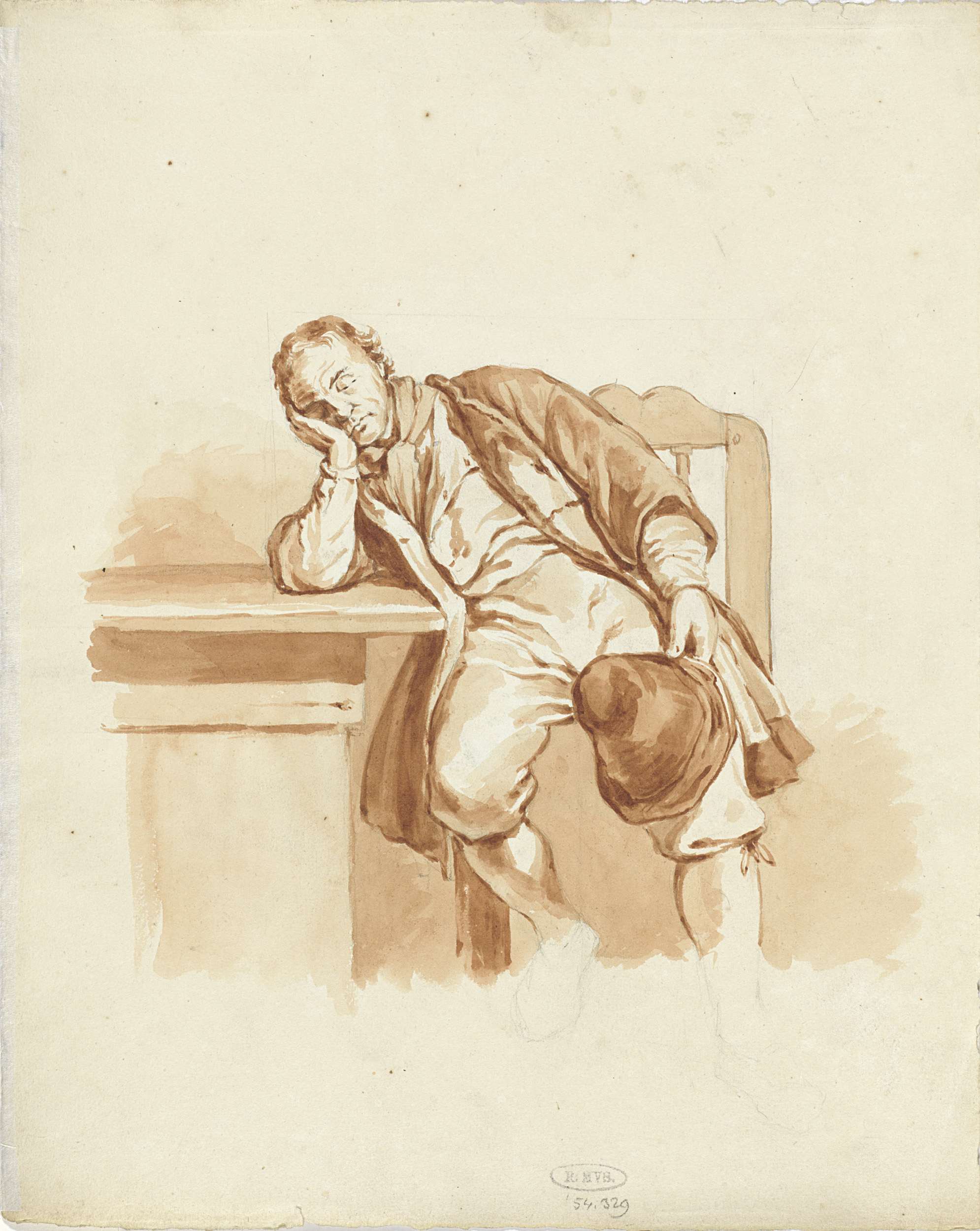 Zittende man, slapend aan een tafel