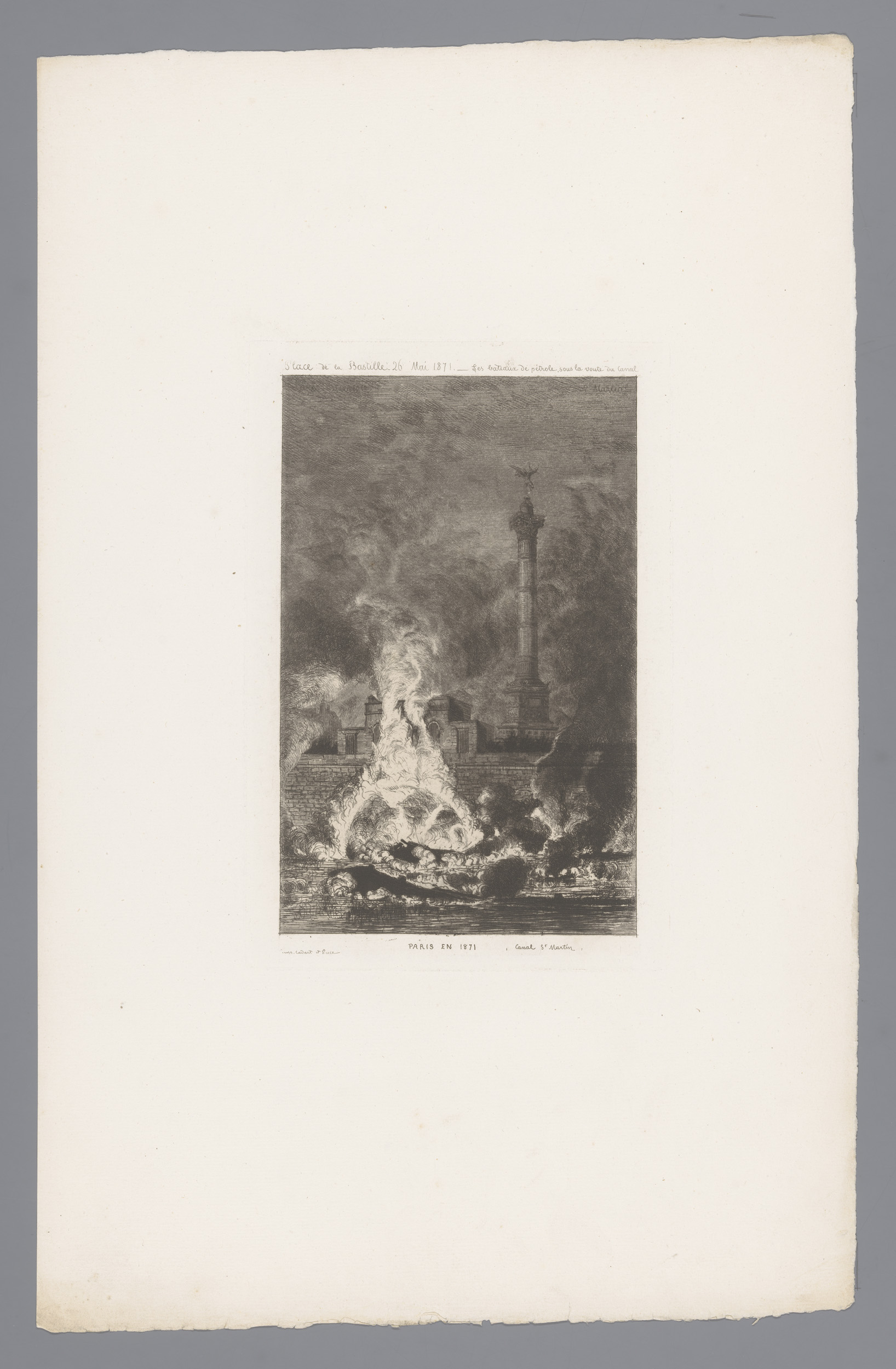 Brandende petroleumschepen in het Canal Saint Martin