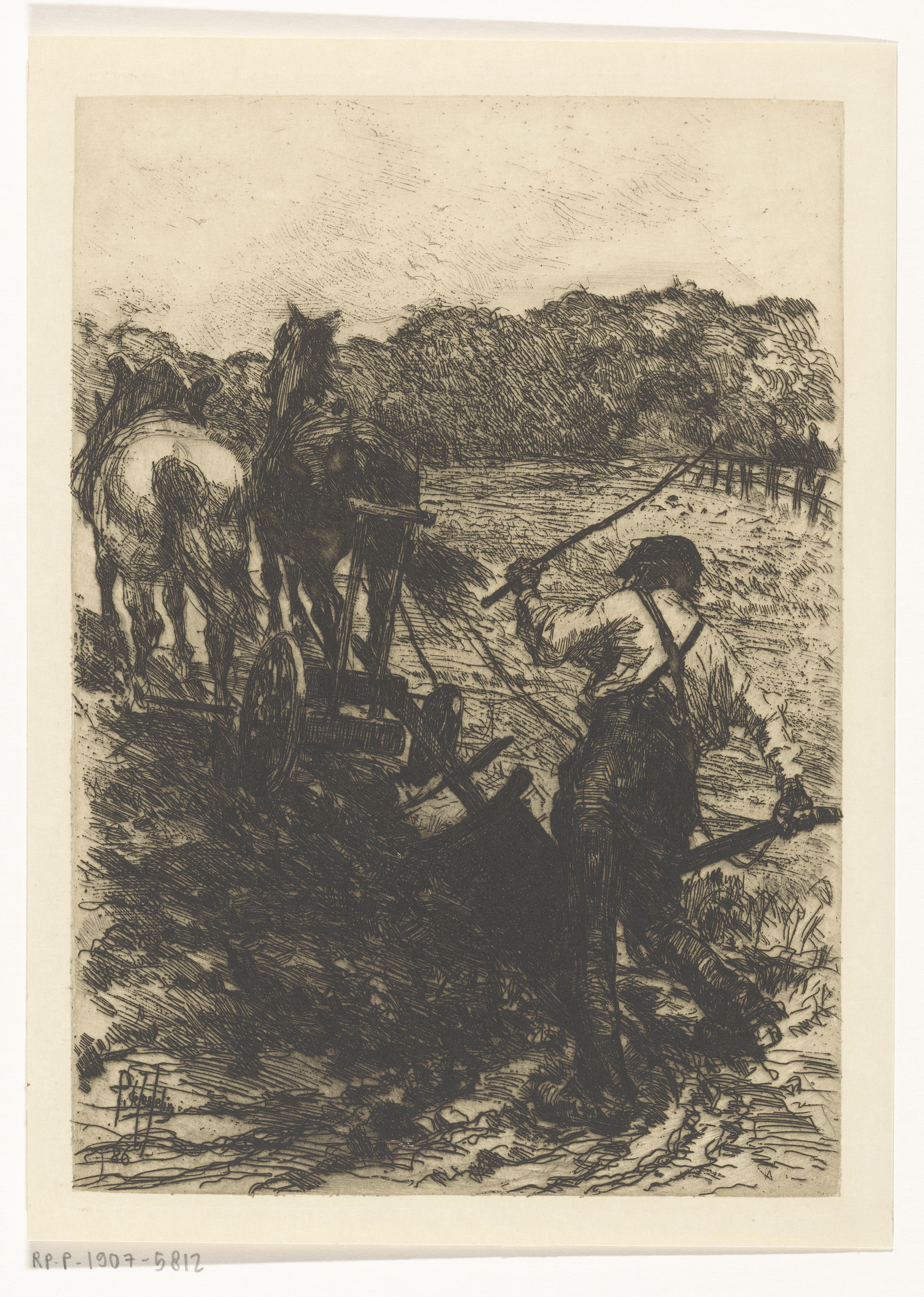 Boer met twee ploegende paarden