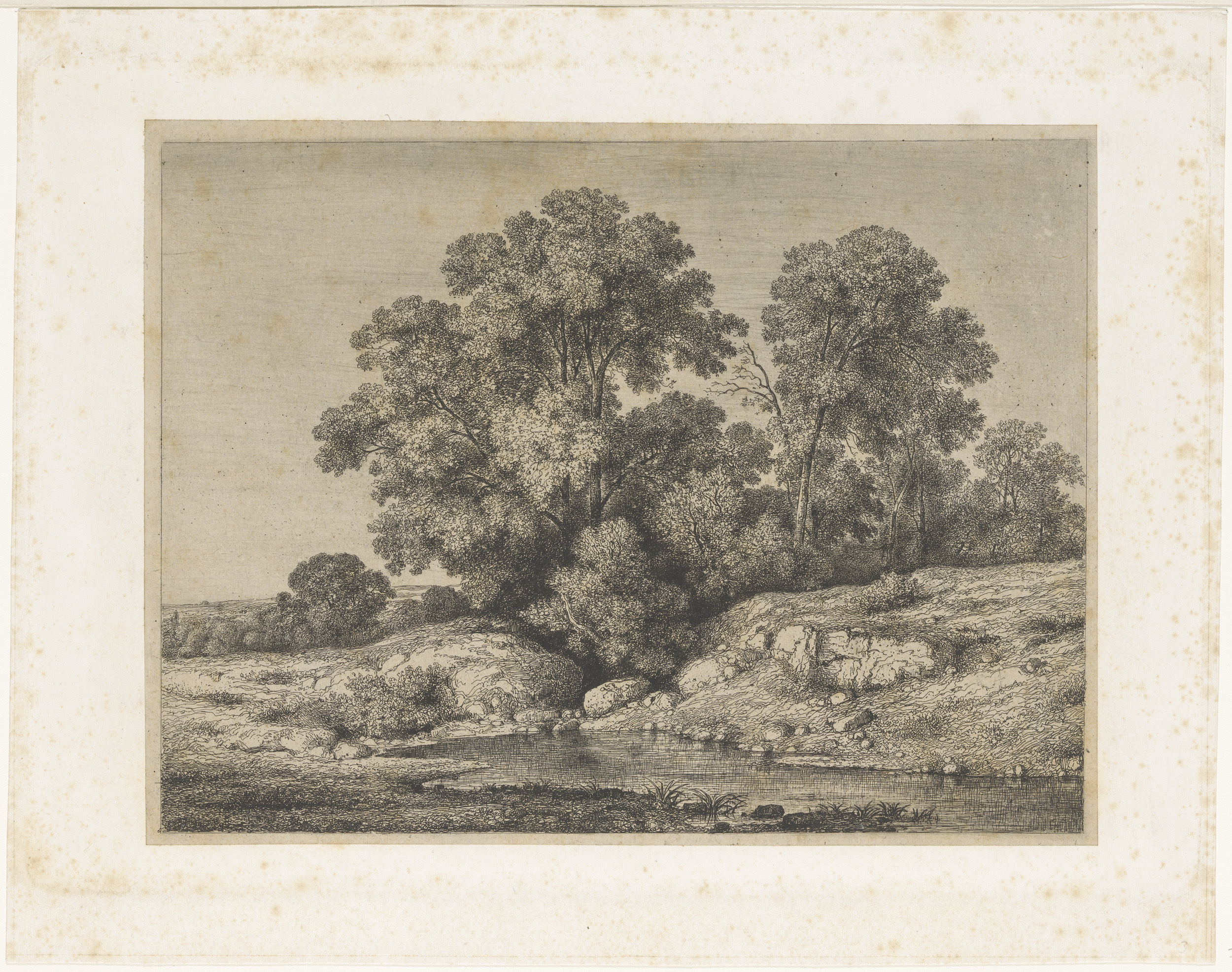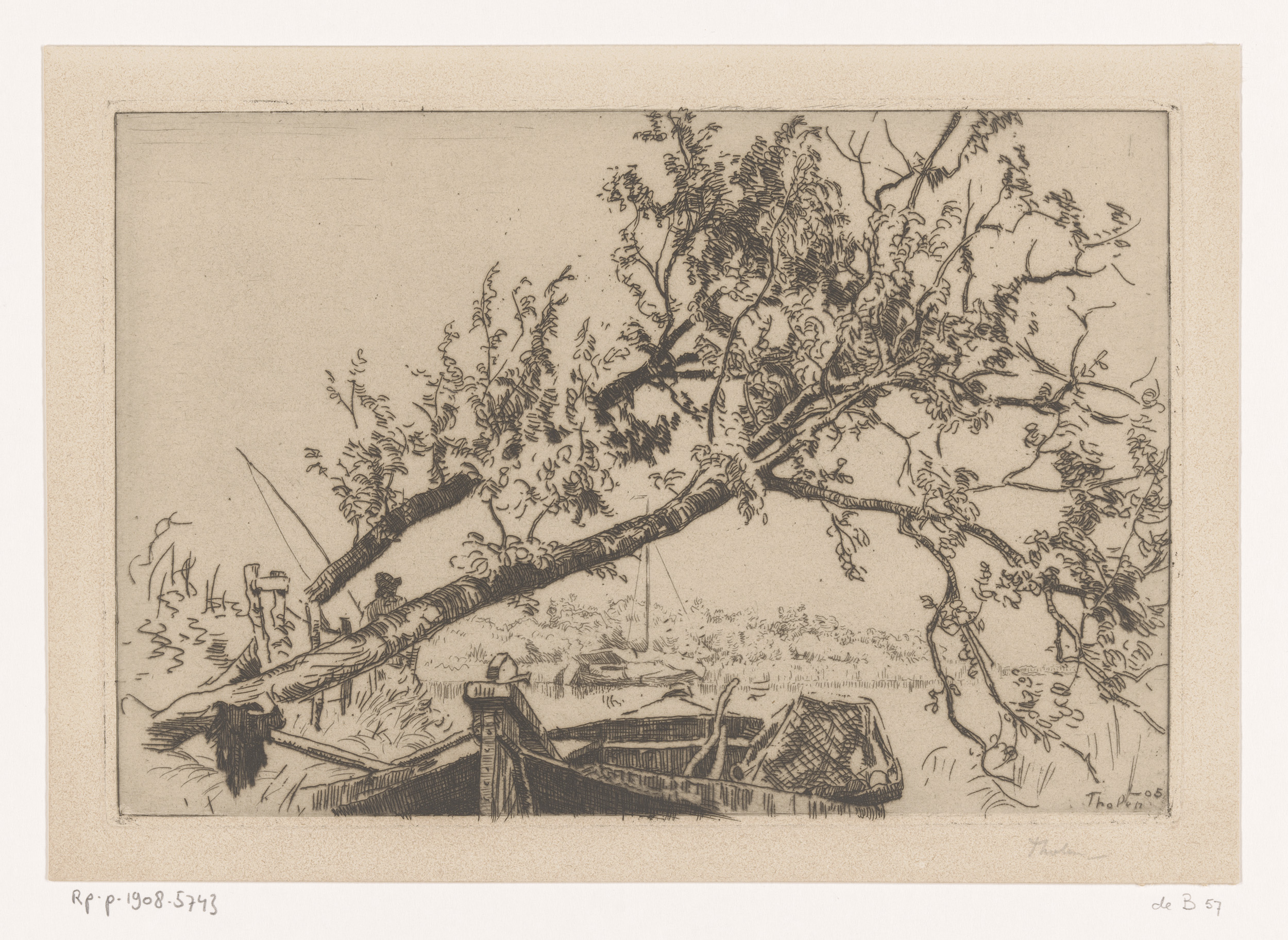 Landschap met omgevallen boom, boten en hengelaar