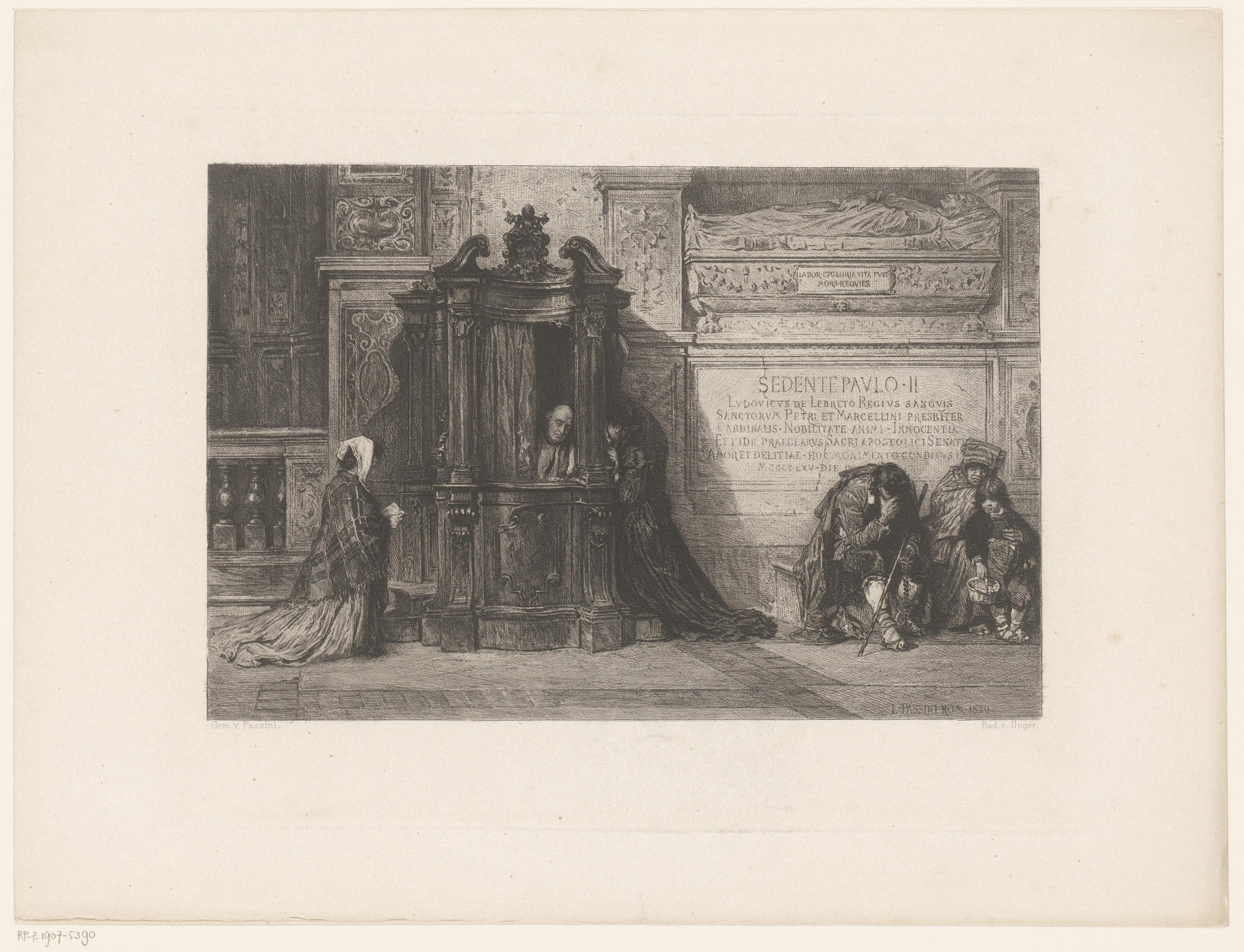 Figuren in een kerk rondom een biechtstoel