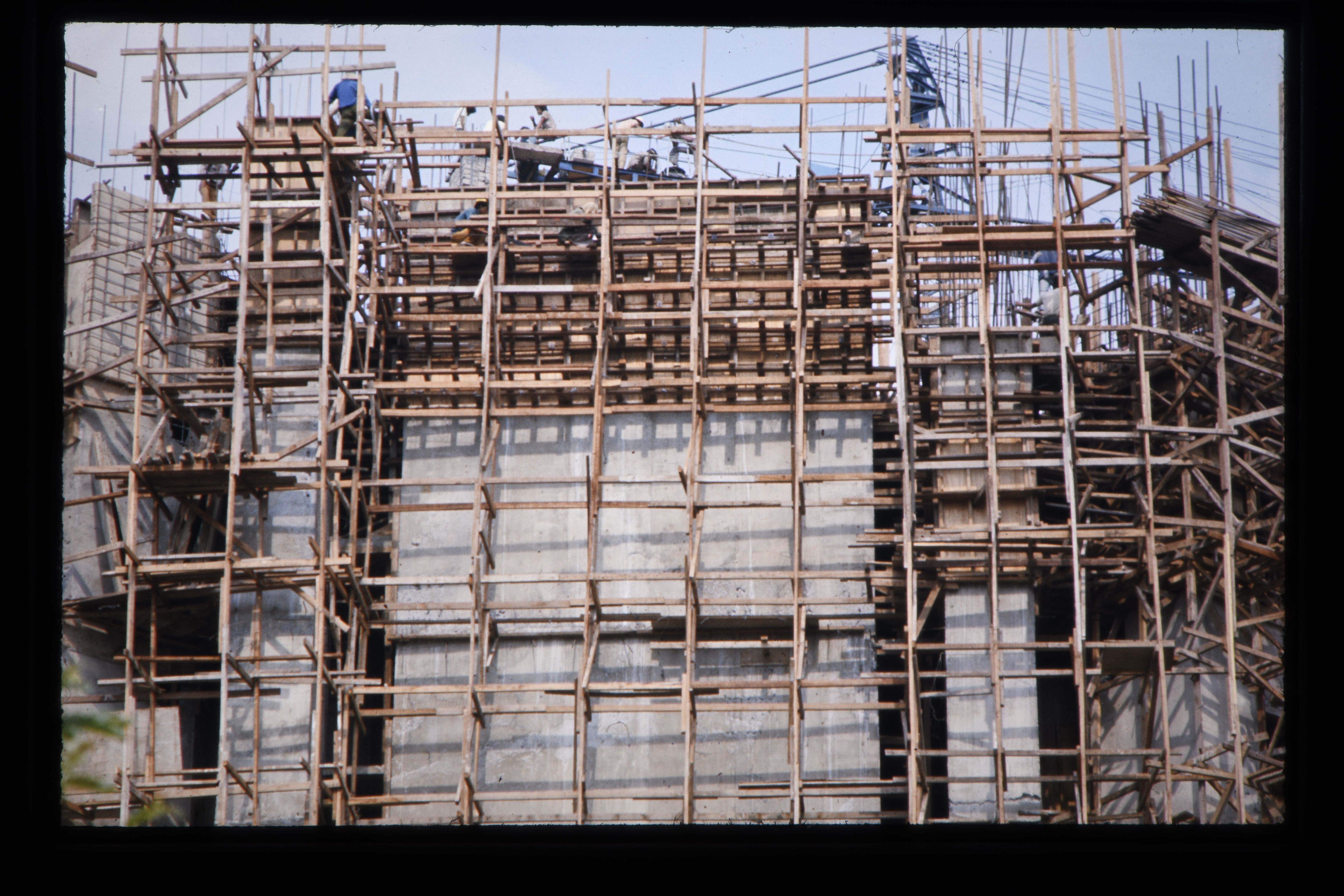 'Hoogbouw met behulp van houten steigers aan de Pass...
