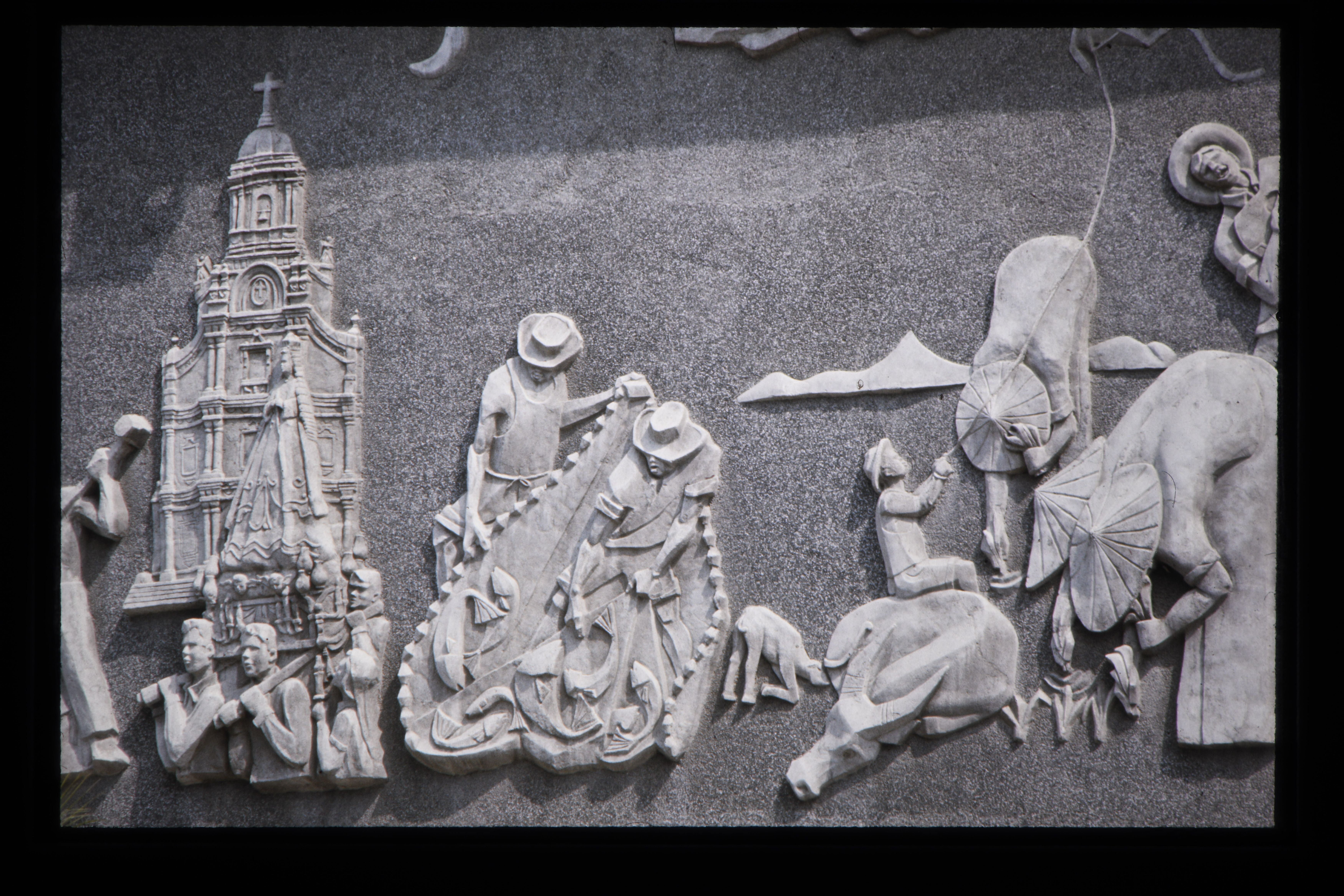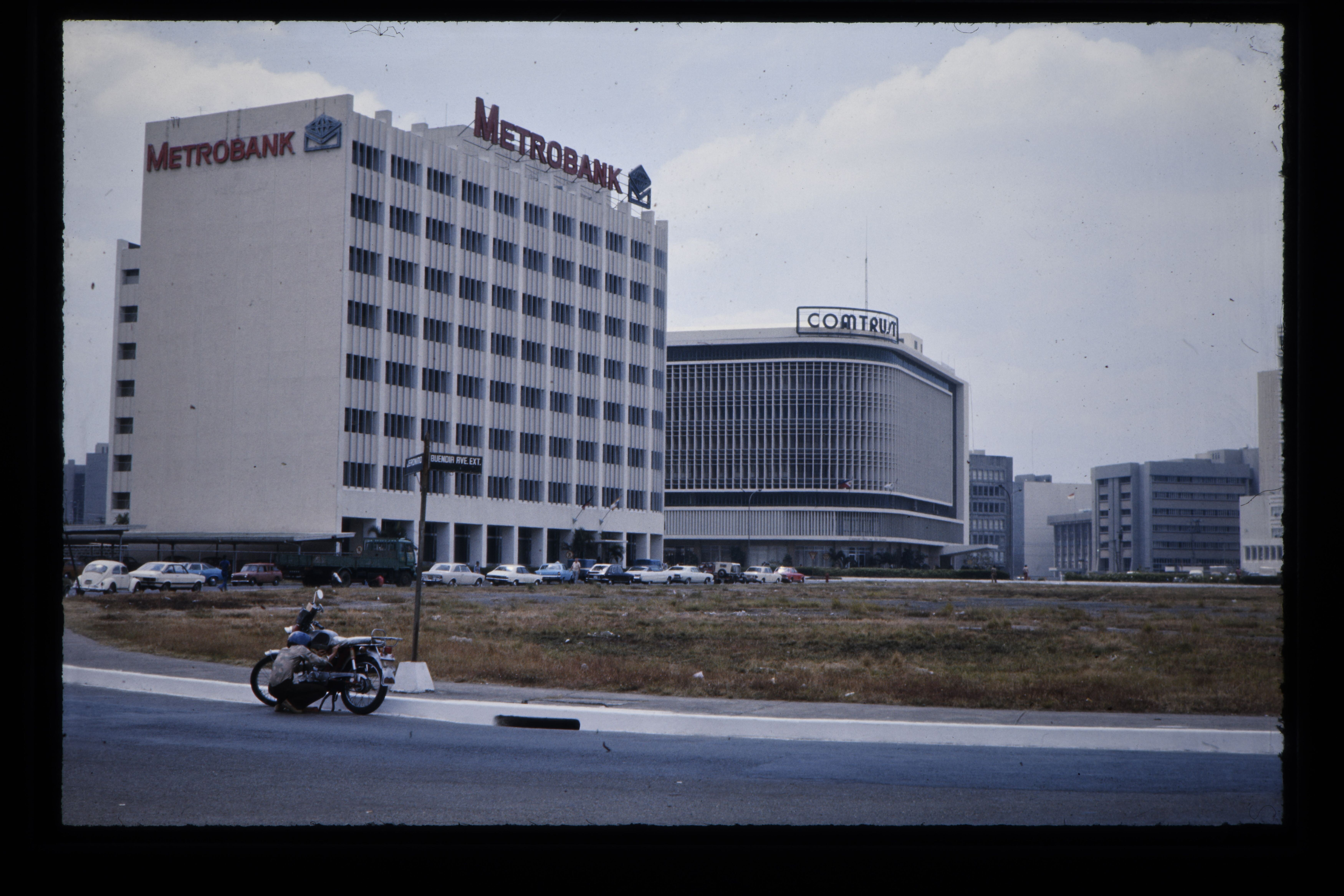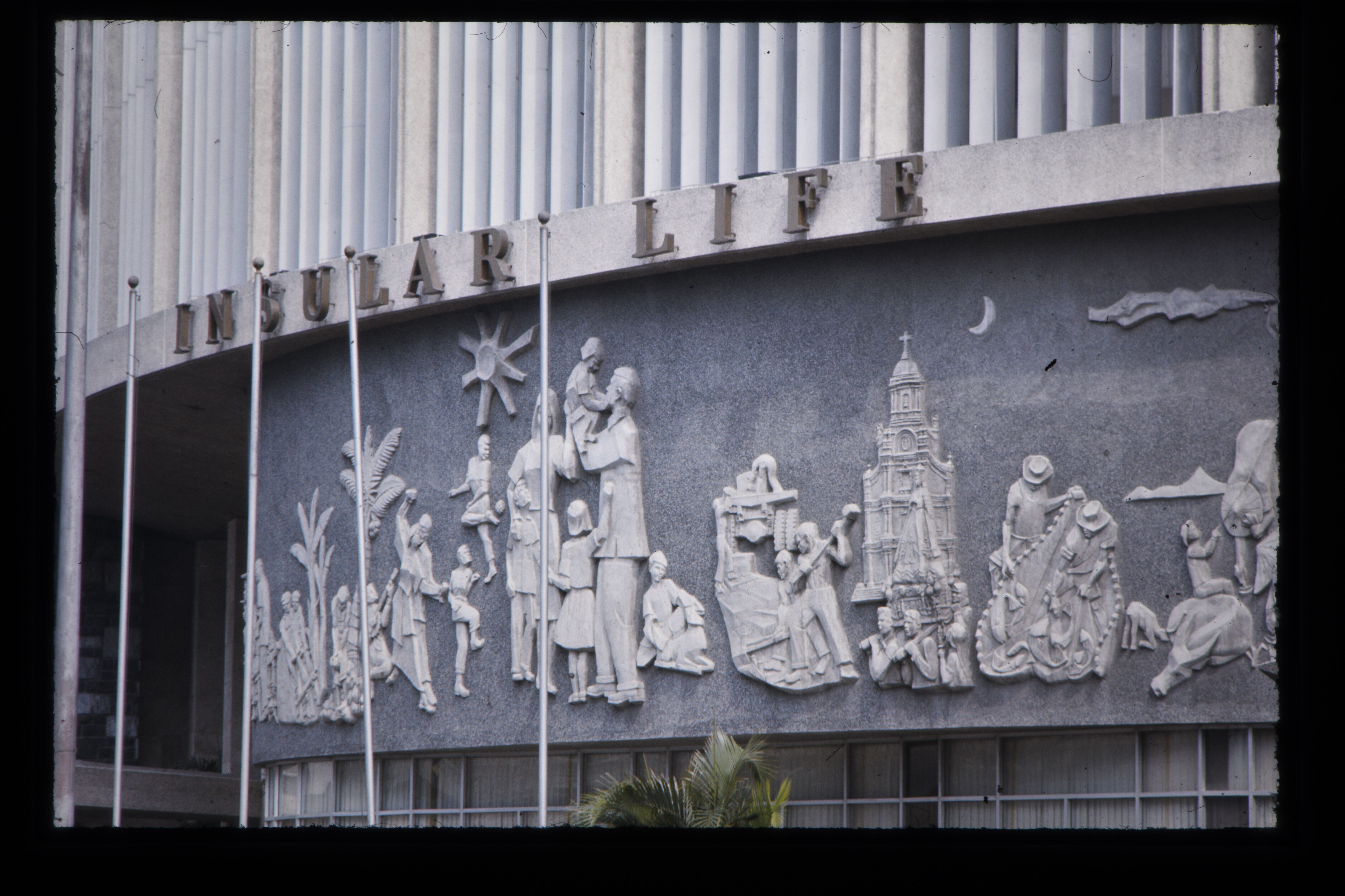'Betonnen reliëfs op een bankgebouw aan de Ayala Ave...