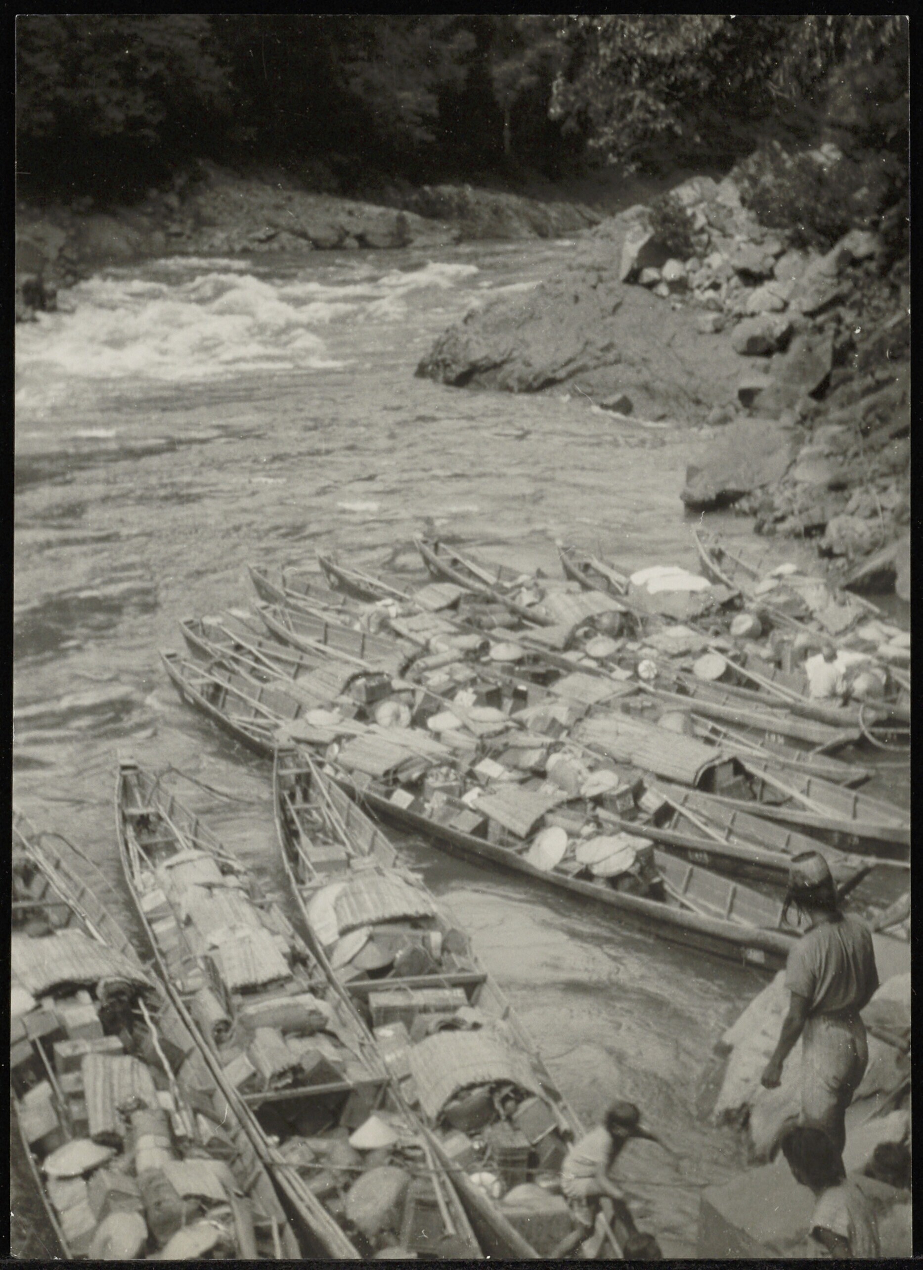 Prauwen voor een stroomversnelling in de Kayan-rivier