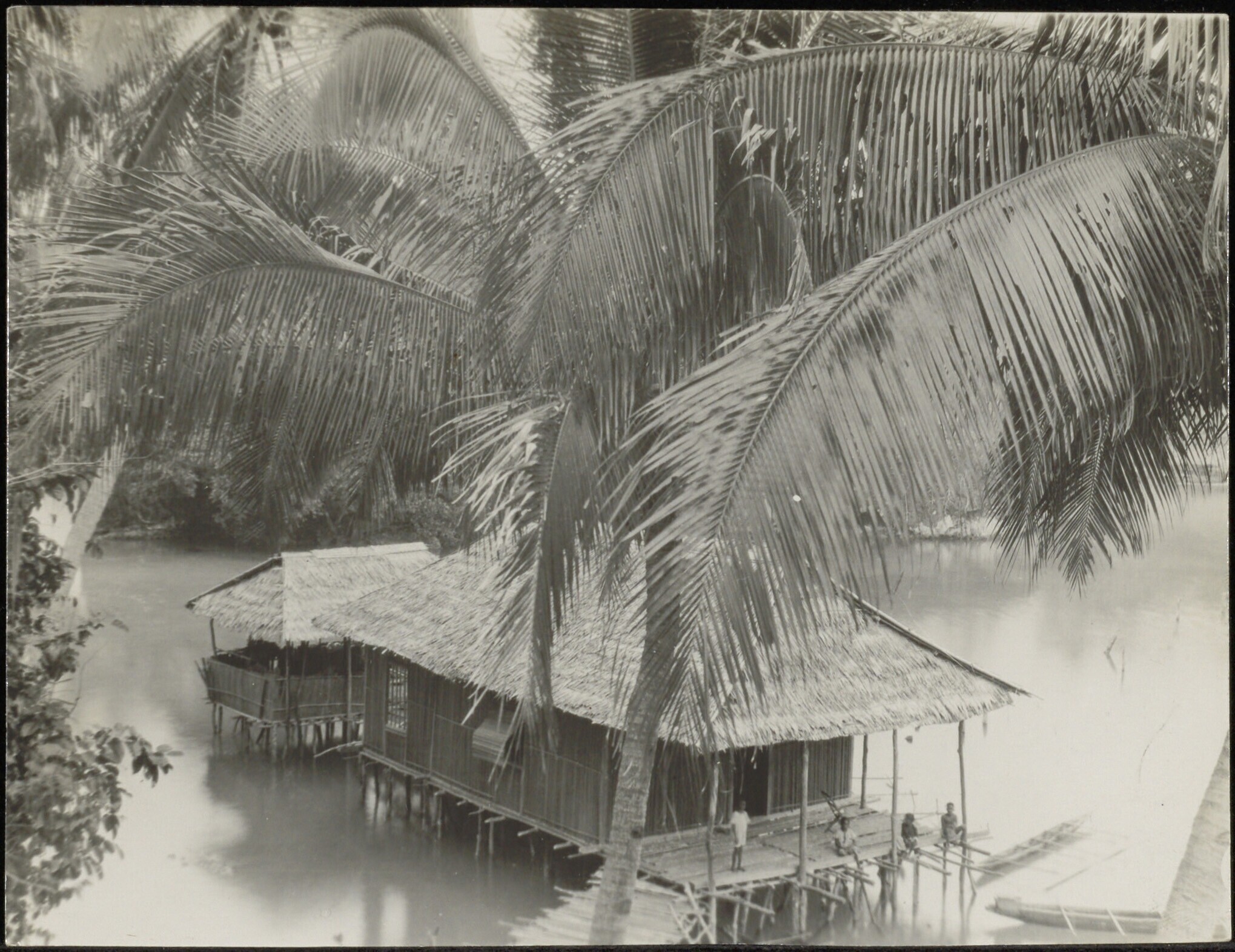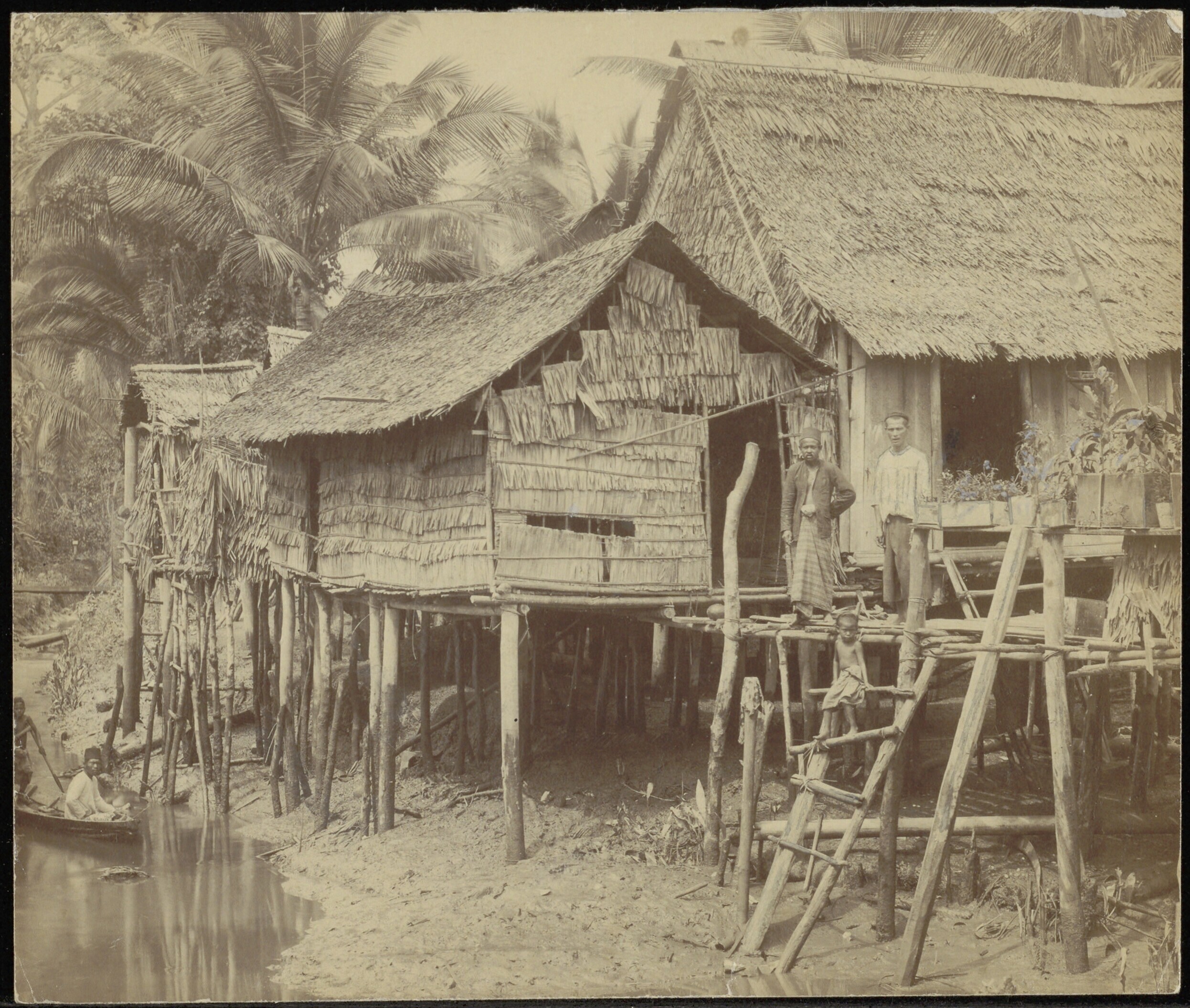 Woning op palen met enkele bewoners aan Sumatra's Oo...