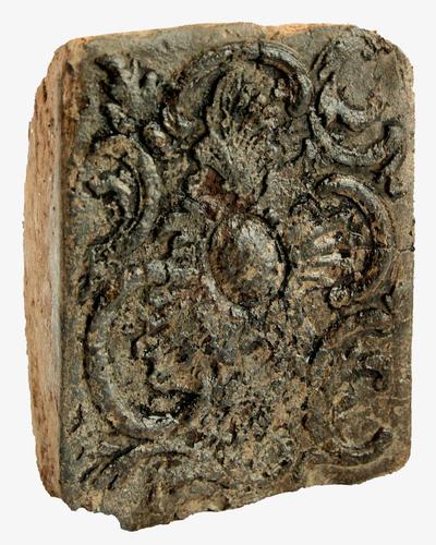 Haardsteen, omlijstingsteen. Lange rand van voluten,...