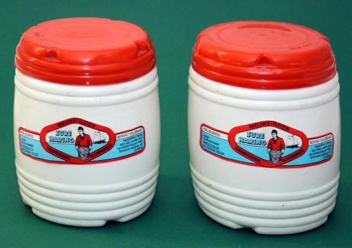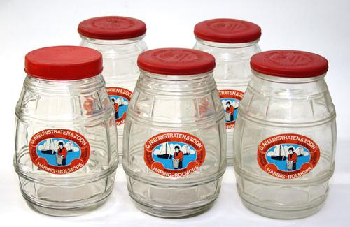 Vijf glazen tonvormige potten met rode schroefdeksel...