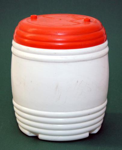 Glazen tonvormige pot met rode metalen schroefdeksel...