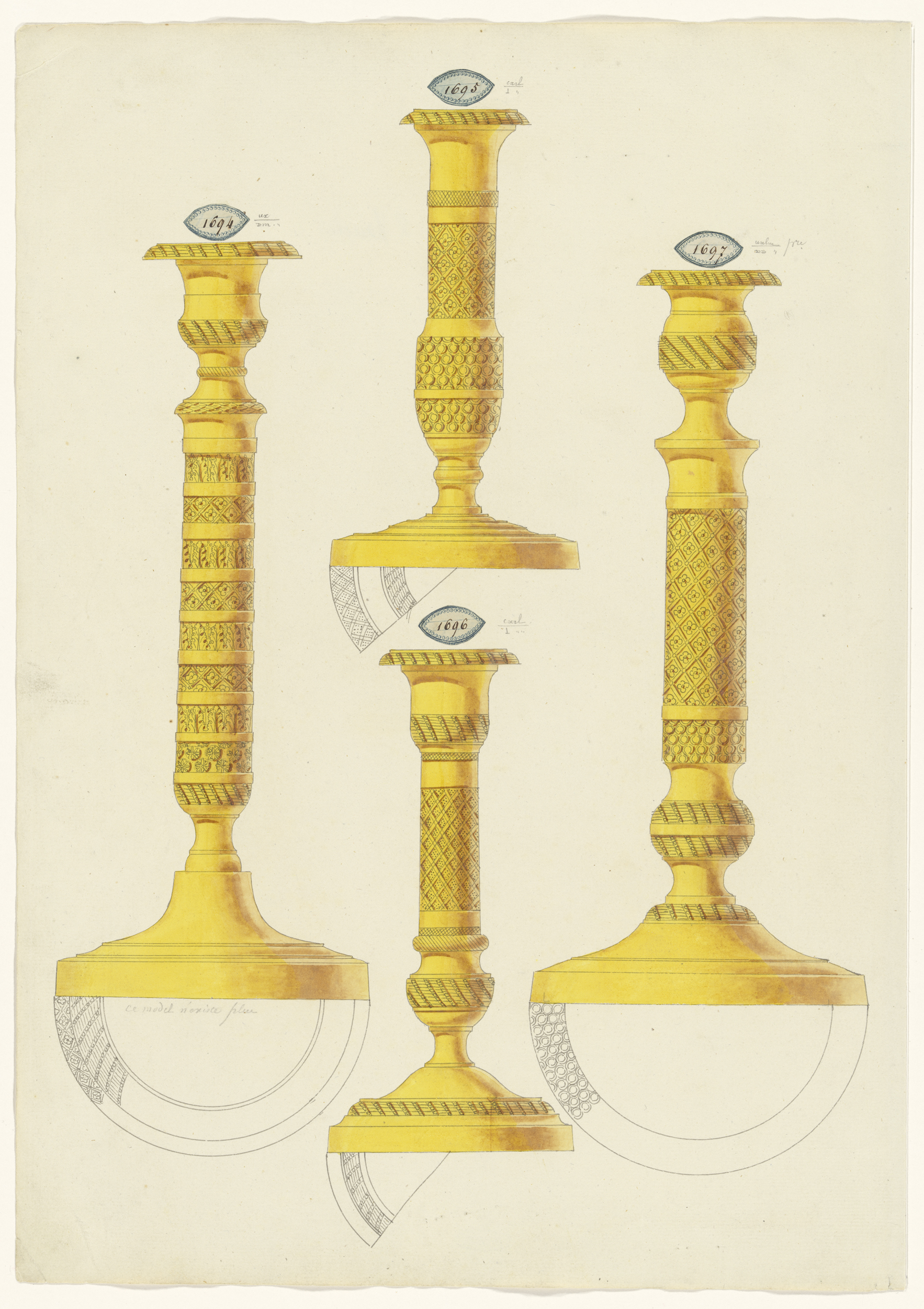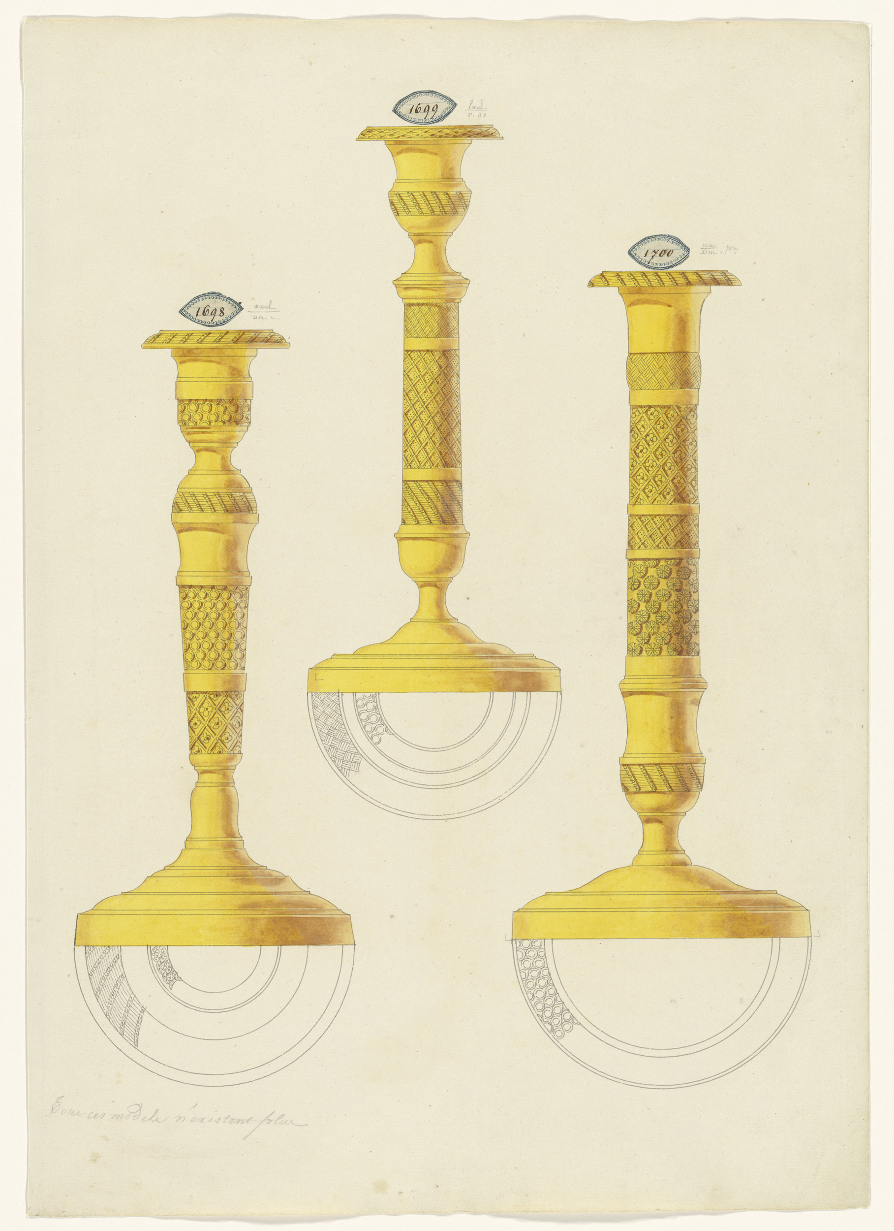 Drie kandelaars, met onder elke kandelaar een gedeel...
