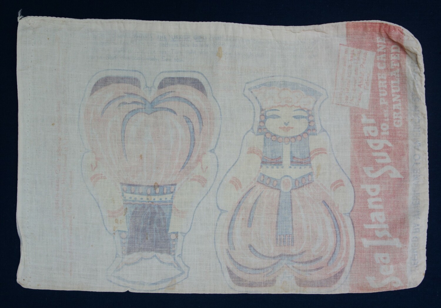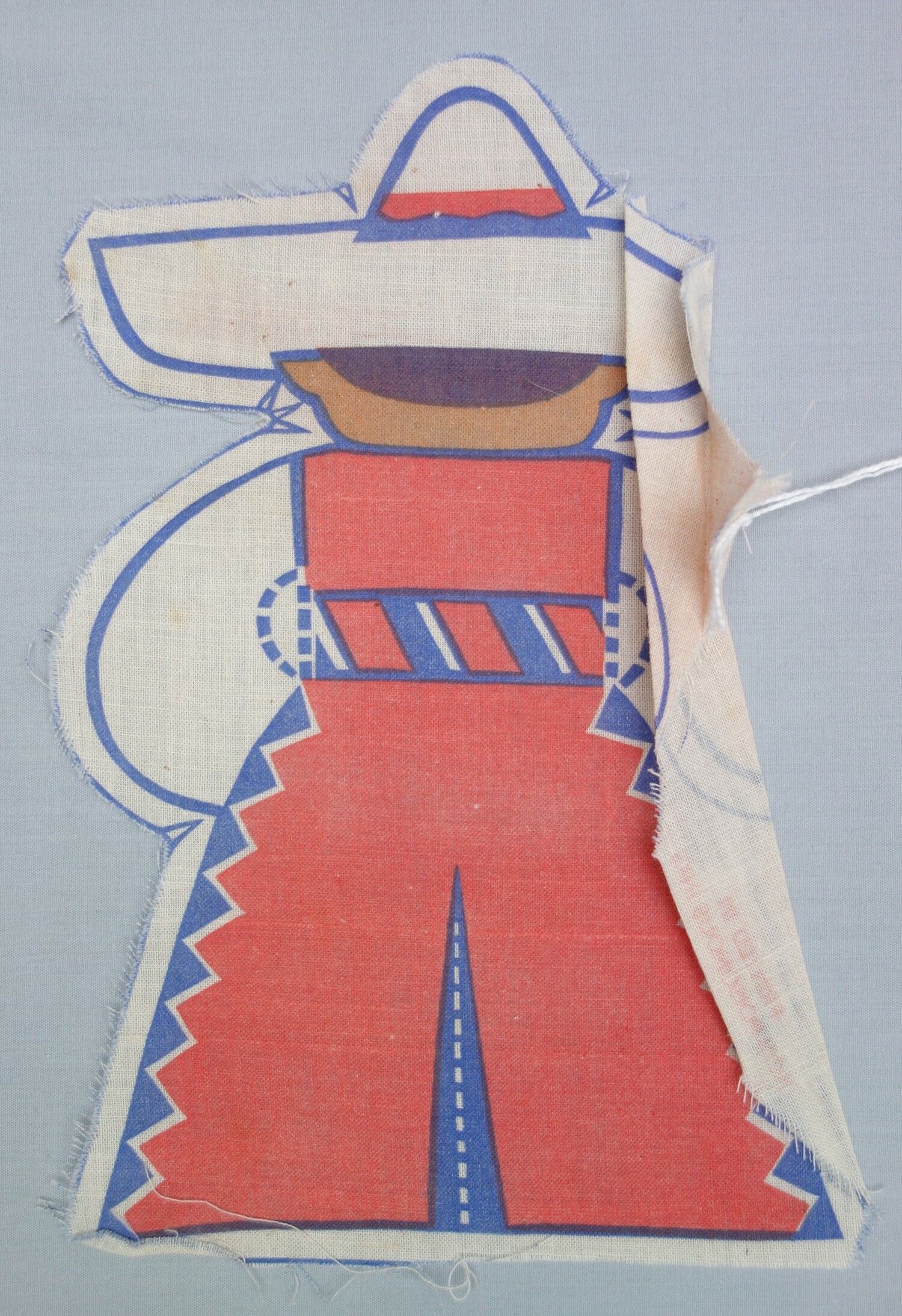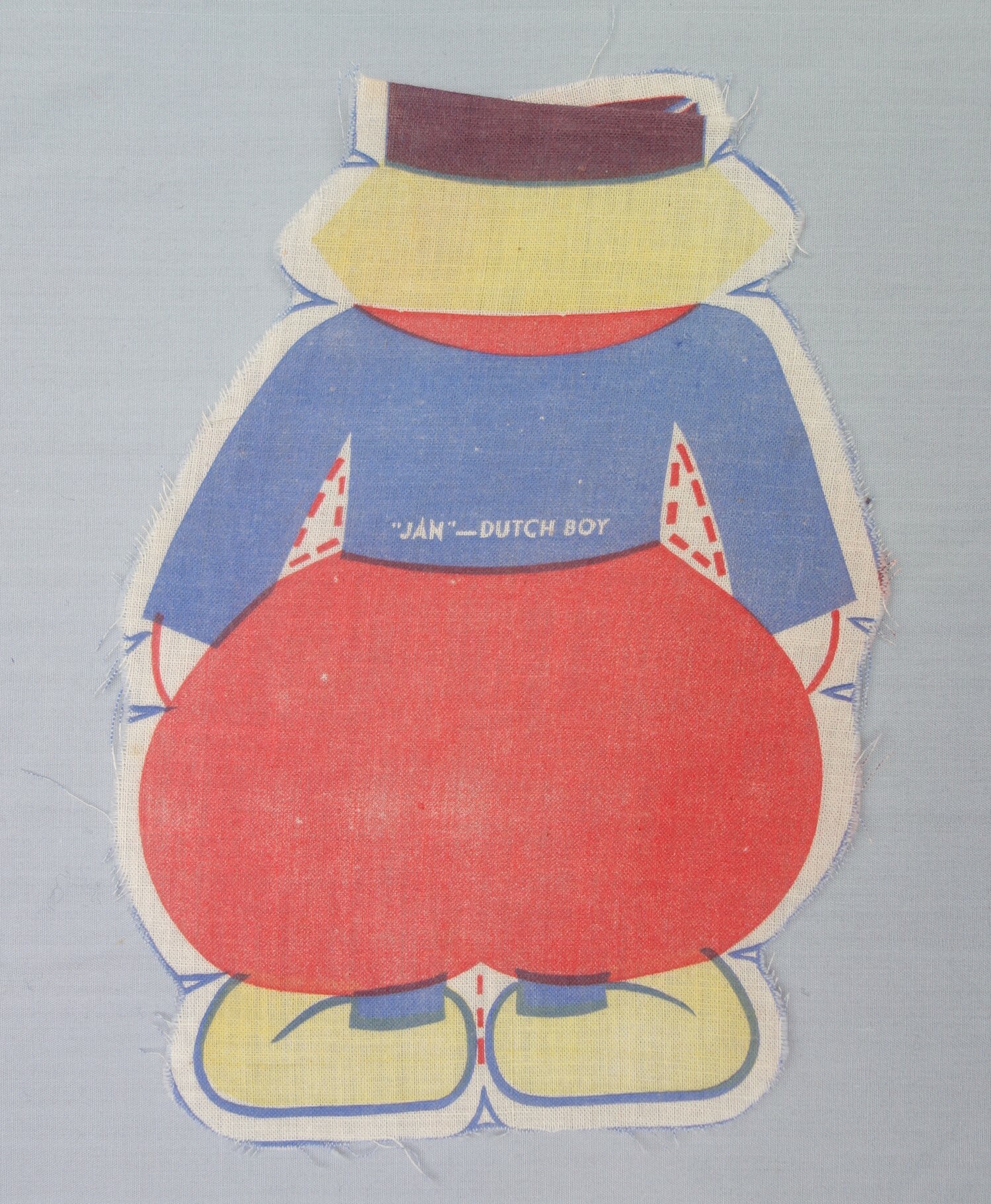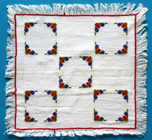 Wit katoenen borduurlapje met vijf vierkanten. 1936.