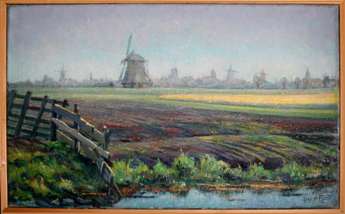Olieverf op doek. Gezicht op Schiedam met koolzaadveld.