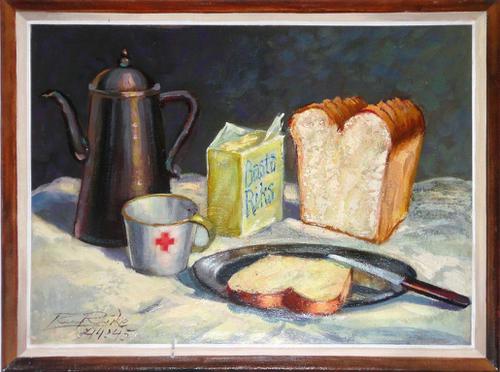 Olieverf op doek. Tafelkleed met een kan, Rodekruis ...