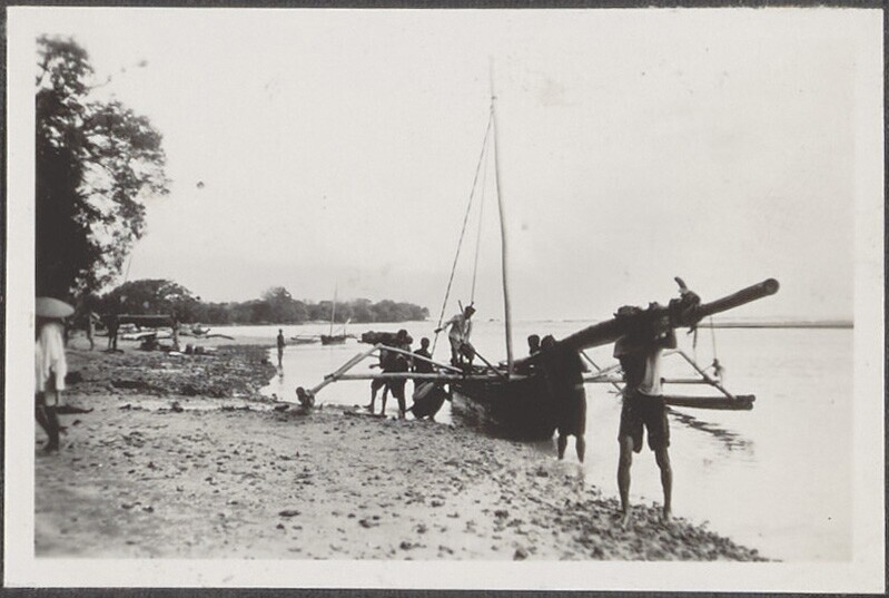 Prauwen lossen hun lading bij een stapelplaats, Tjil...