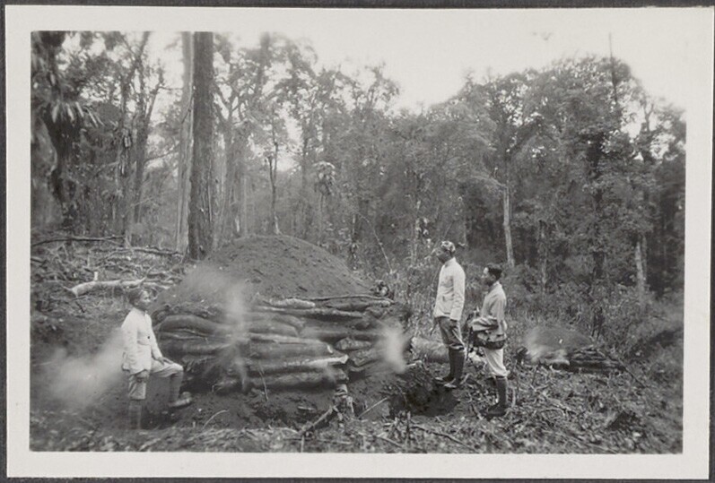 Mannen voor een hut met opgeslagen planken merbauhou...
