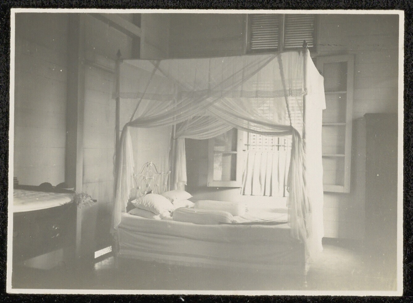 Een bed met klamboe, guling en sapu lidi in de slaap...