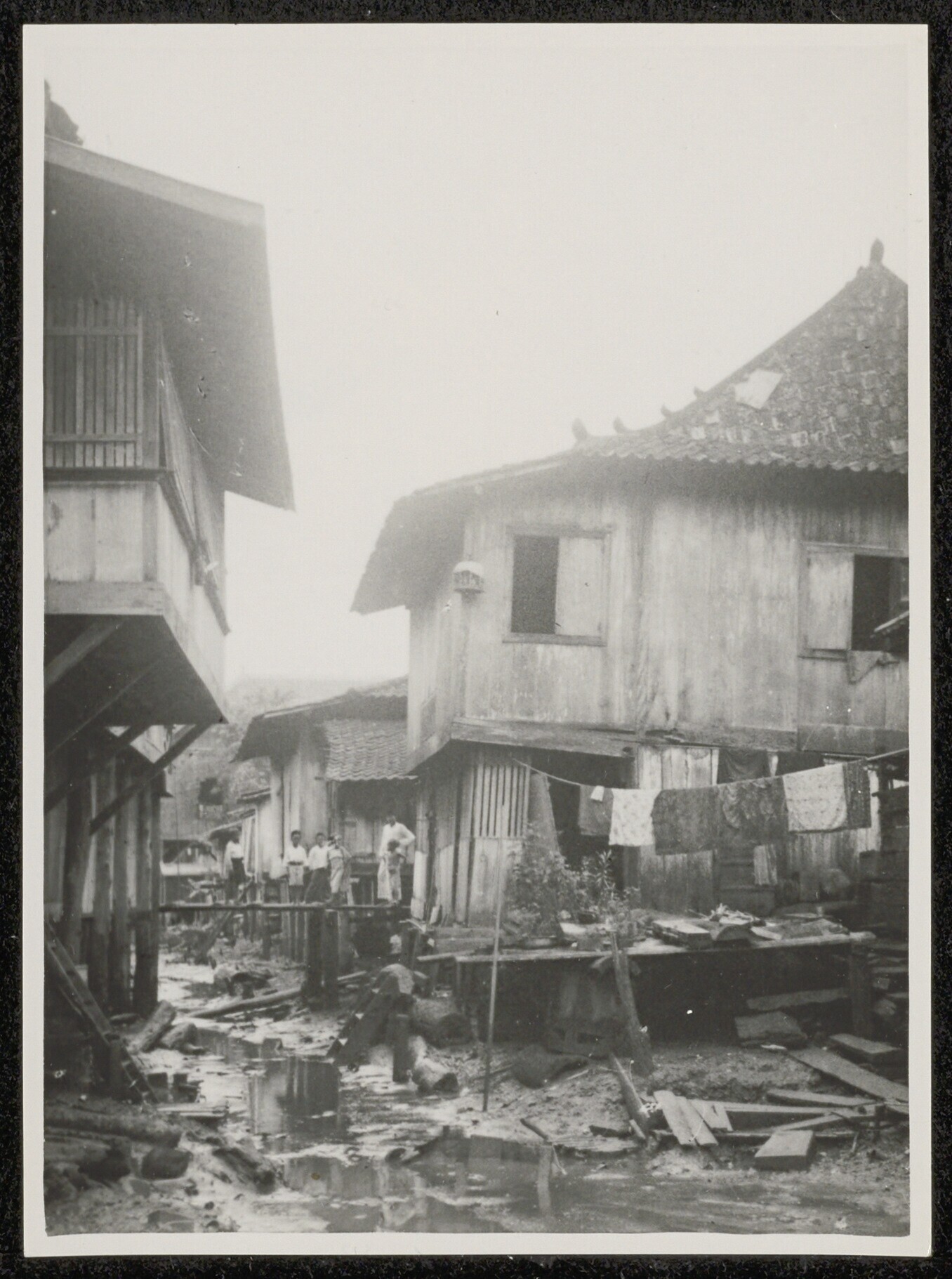Mannen voor een hut met opgeslagen planken merbauhou...