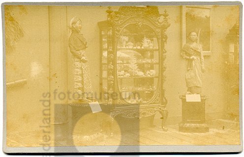 Opstelling van voorwerpen uit Nederlands-Indië in ee...