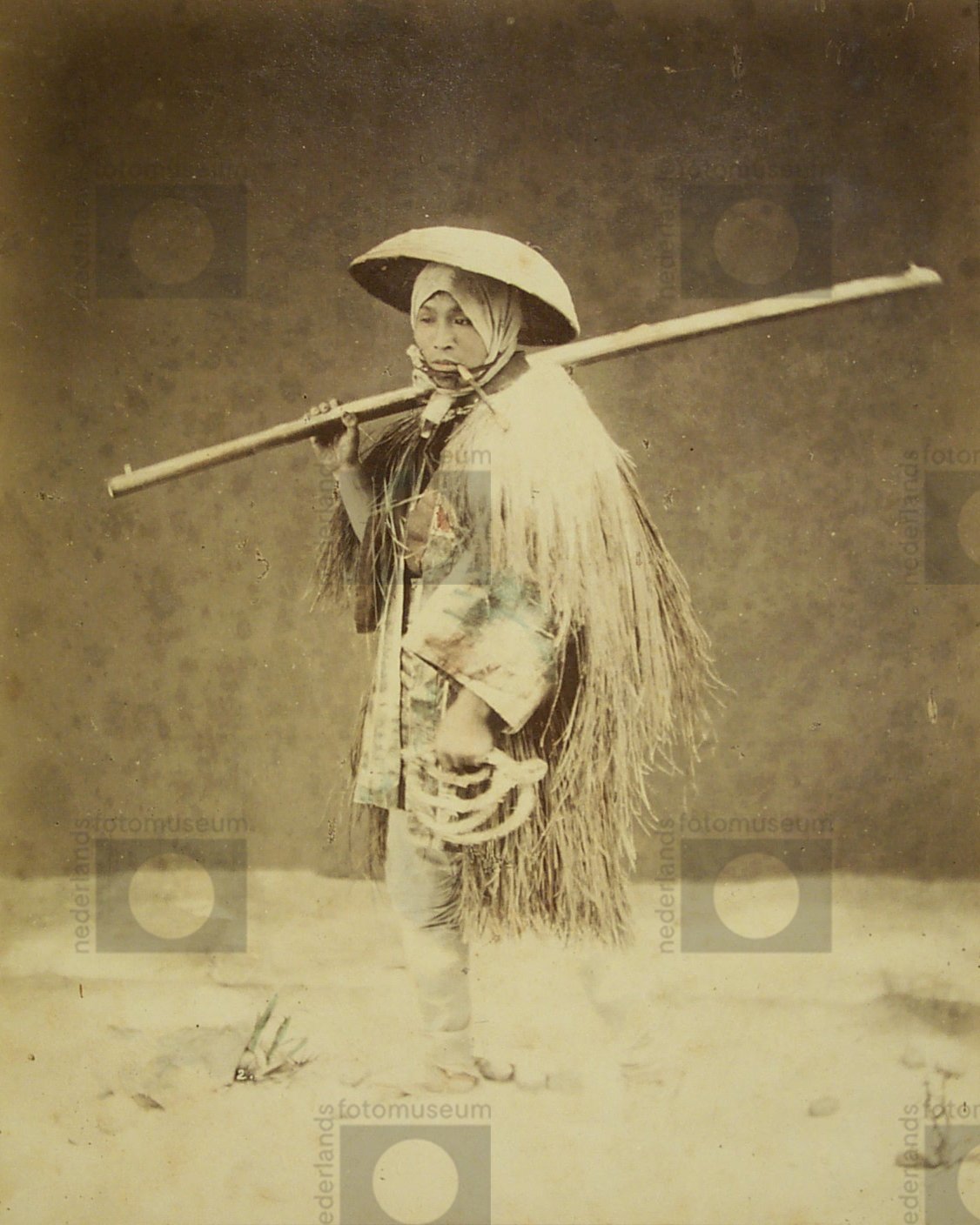 Studioportret, winterscene, drager met juk, Yokohama...