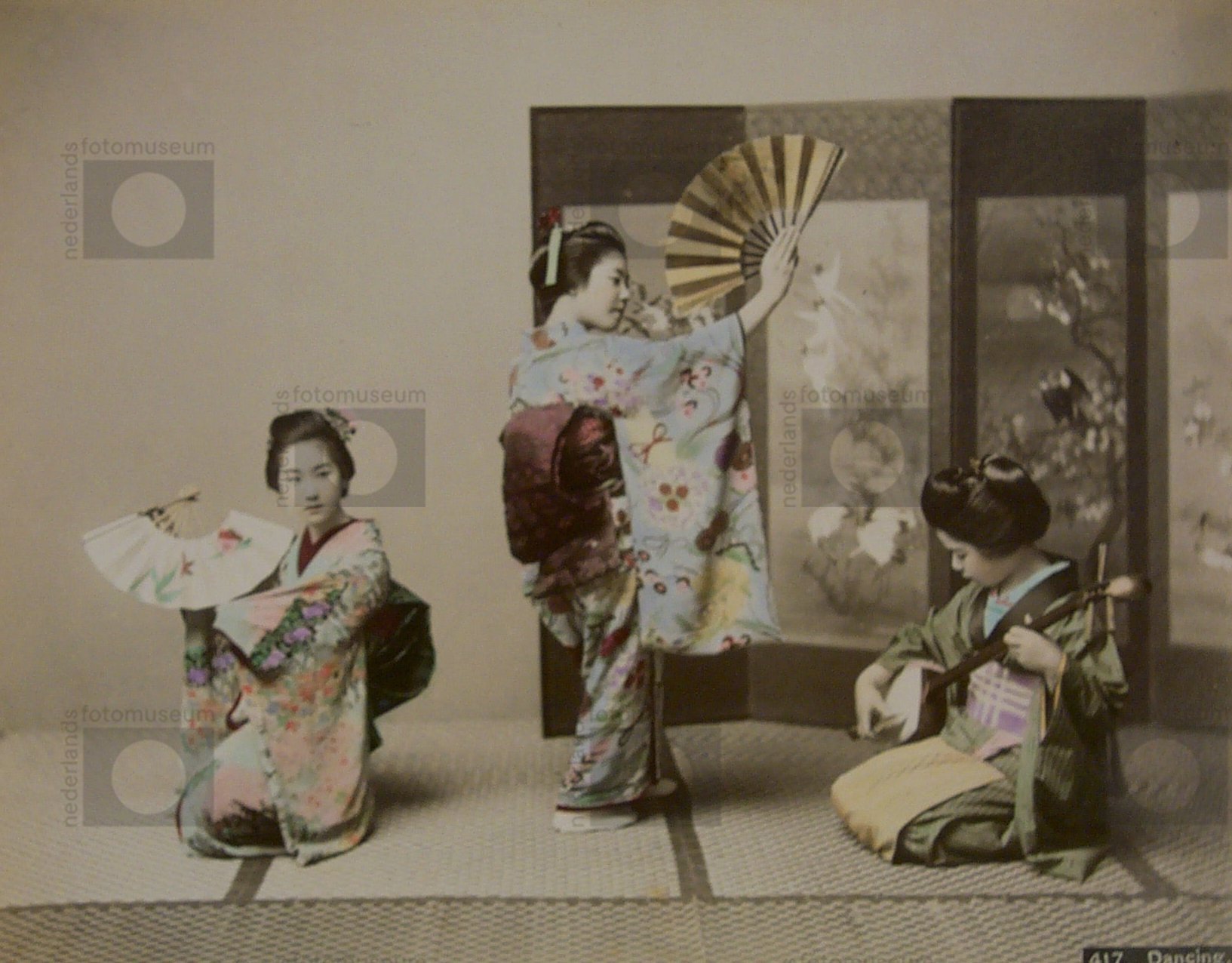 Dansende geisha's met waaiers, Japan (1881-1914)